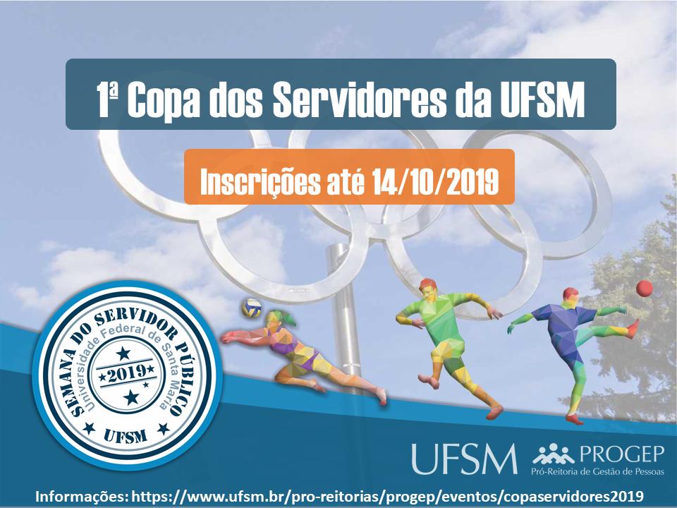 A Pró-Reitoria de Gestão de Pessoas informa que as inscrições para a 1ª Copa dos Servidores da UFSM encerram na segunda-feira, dia 14/10/2019