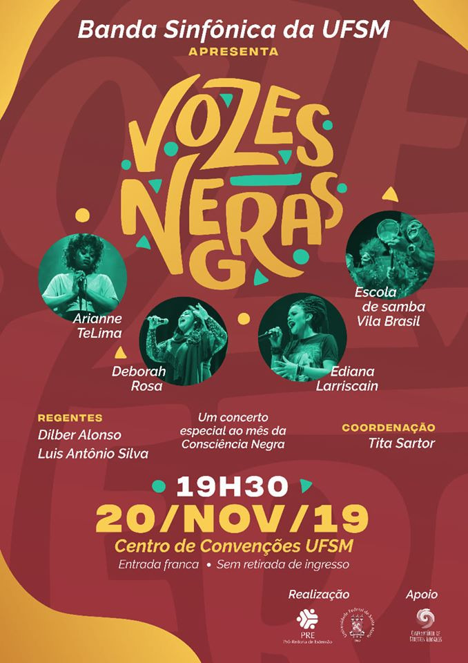 Na programação do mês da Consciência Negra da Universidade Federal de Santa Maria, a Banda Sinfônica da UFSM apresenta o espetáculo: ” Vozes Negras”, que será realizado no dia 20, às 19h30min no Centro de Convenções. A entrada é franca e por ordem de chegada. Durante o mês em que paramos para refletir e debater as questões da negritude no país, a Banda apresenta um espetáculo cheio de protagonismo negro, desde a sua concepção até sua execução, várias vozes negras estão trabalhando e envolvidas nesse projeto.