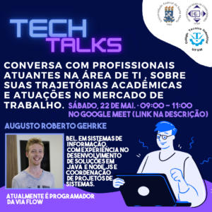 Neste sábado (22), ocorrerá o evento Tech Talks, onde haverá uma conversa entre alunos e profissionais da área de TI. A principal pauta é sobre a trajetória desses profissionais no meio acadêmico, sobre o mercado de trabalho e onde e com o que atuam no mercado.