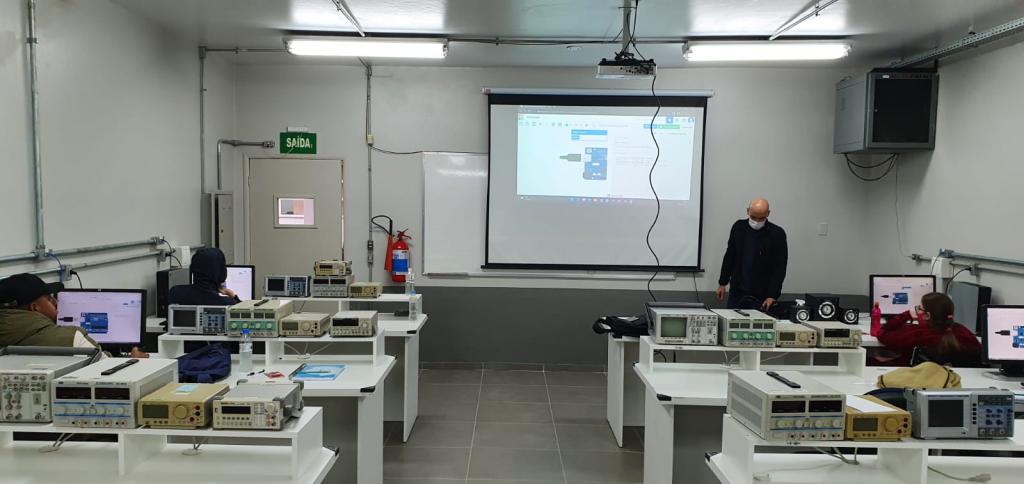 A aula ocorreu no laboratório de eletrônica do CTISM. Todas as aulas presenciais se darão de forma prática e ocorrem nas quartas das 14:00 as 18:00 horas e mais duras horas de atividades remotas. O curso tem carga horária de 160 horas e terá duração até dezembro.