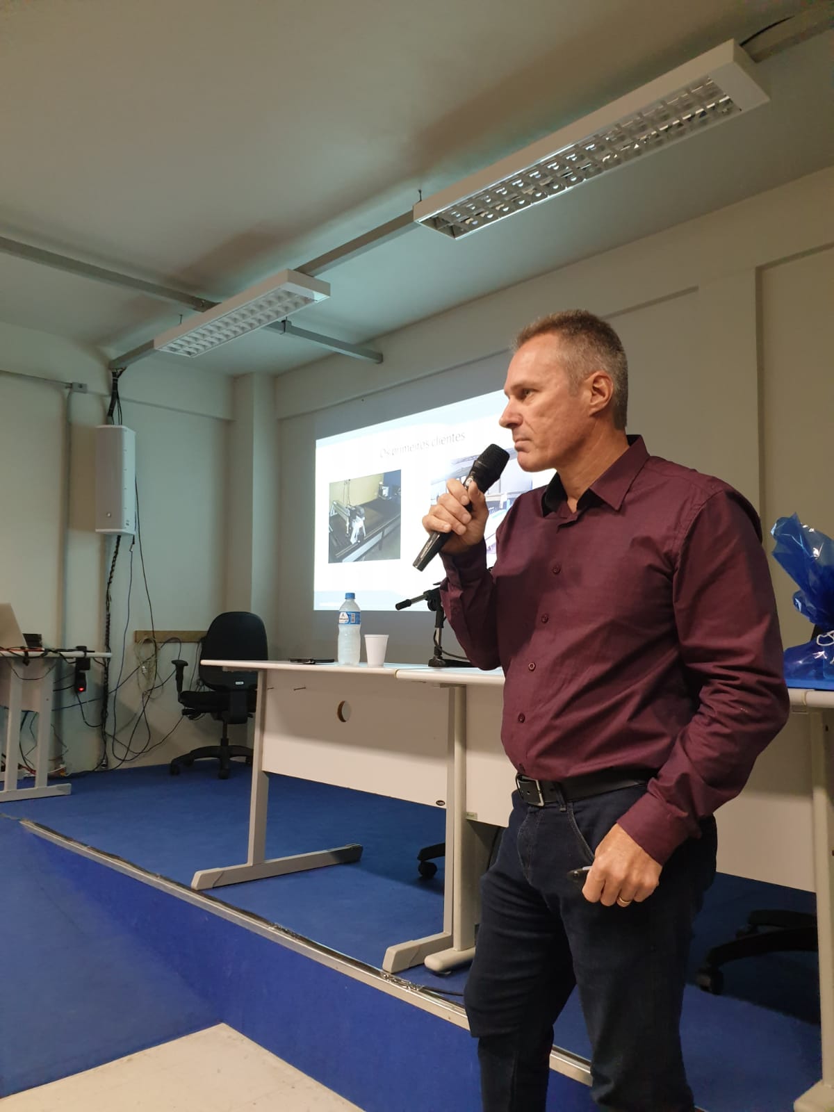 E no dia 8/11 foram duas palestras a primeira foi a empresa TSB máquinas, com a tema da palestra sendo “ Os desafios de empreender: o caminho da concepção até a inserção do produto no mercado”, ministrada pelo empresário Leonardo Kozoroski Veiga egresso do CTISM do curso técnico em mecânica.