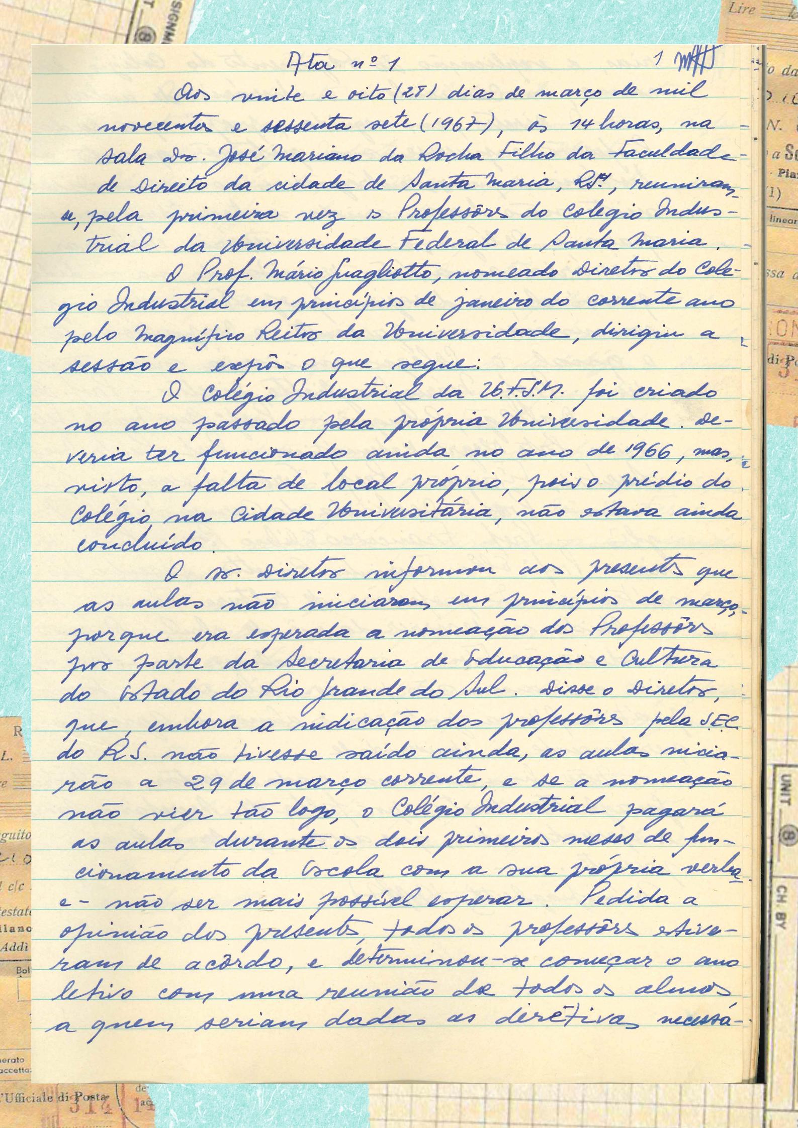 E para começar, nada mais justo que trazer a Ata da primeira reunião do então diretor, Mário Guagliotto com o corpo docente do colégio. A reunião realizou-se no dia 28 de março de 1967, dia antes da primeira aula do CTISM, que aconteceu no dia 04 de abril do mesmo ano. A ata se encontra no Livro de Atas n. 1. Para melhor compreensão, a terceira imagem traz a transcrição do documento.