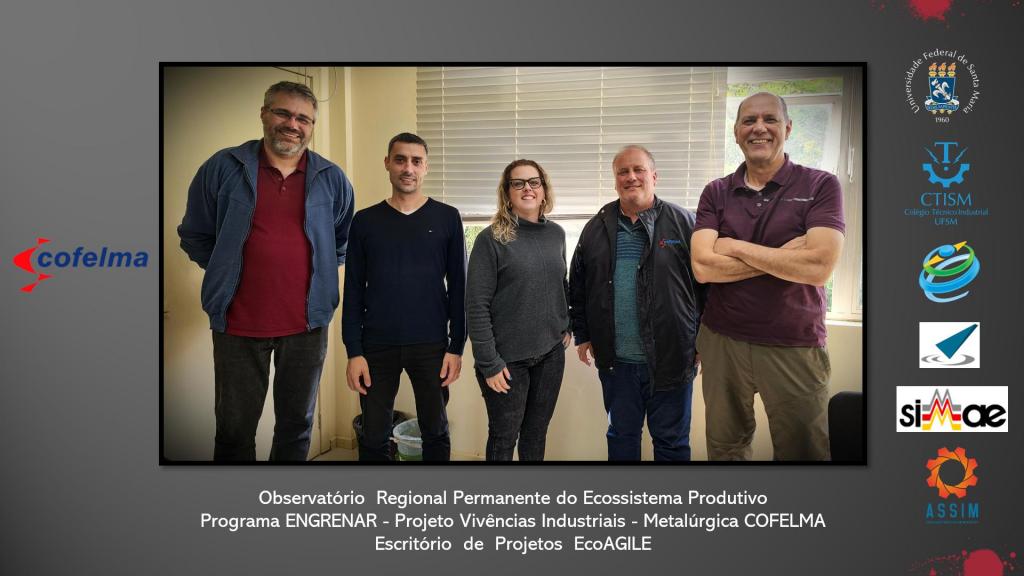 Com esse intuito, no dia 06 de outubro, foi realizada reunião de trabalho com a empresa Metalúrgica COFELMA, que contou com as participações do Diretor – Vicente Denardin, da Gerente de Recursos Humanos – Carina Denardin, do Diretor do CTISM – Rafael Adaime Pinto, do Vice-Diretor – Fredi Zancan Ferrigolo, do Coordenador do Curso Superior de Tecnologia em Fabricação Mecânica – Fernando Mariano Bayer e do Coordenador do Escritório de Projetos EcoAGILE – Claudio Weissheimer Roth.