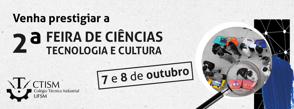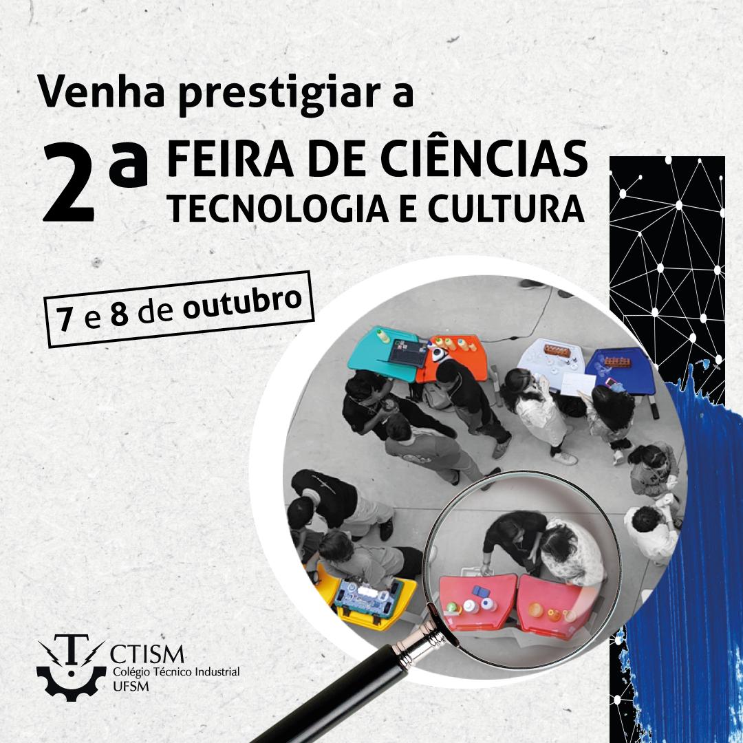 O Colégio Técnico Industrial de Santa Maria (CTISM), convida a todos a prestigiarem a 2° feira de ciências tecnologias e cultura, a feira contará com apresentações das pesquisa e projetos dos alunos do cursos técnicos integrados e subsequente e da graduação do colégio, a feira ocorre nos dias 07 (sexta-feira) até o dia 08 (sábado) de outubro, no dia 07 das 09:00 até as 17:30 com intervalo ao meio dia até as 13:30, no sábado o horário será das 8:30 as 12:00.