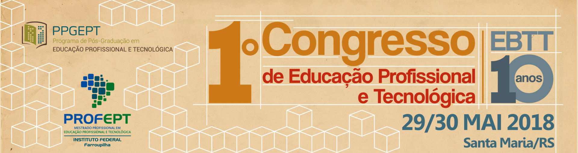 1º CONGRESSO DE EDUCAÇÃO PROFISSIONAL E TECNOLÓGICA: EBTT 10 anos, surge numa tentativa de consolidar os estudos, pesquisas e parcerias que vêm sendo realizados, em dois programas de Pós-Graduação, o Programa de Pós-Graduação em Educação Profissional e Tecnológica (PPGEPT) e o Mestrado Profissional em Educação Profissional e Tecnológica (PROFEPT). Os Programas se vinculam respectivamente ao Colégio Técnico Industrial de Santa Maria e ao Instituto Federal Farroupilha câmpus Jaguari. A iniciativa de organizar este evento nasce a partir da articulação existente entre os grupos de pesquisa: Metodologias Ativas para EPT (MAEPT) e o Grupo de Estudos e Pesquisas e Formação Inicial e Continuada de Professores (MAGMA), grupos que representam os programas. A ideia é que o evento articule as pesquisas e atividades de ambos programas e instituições.