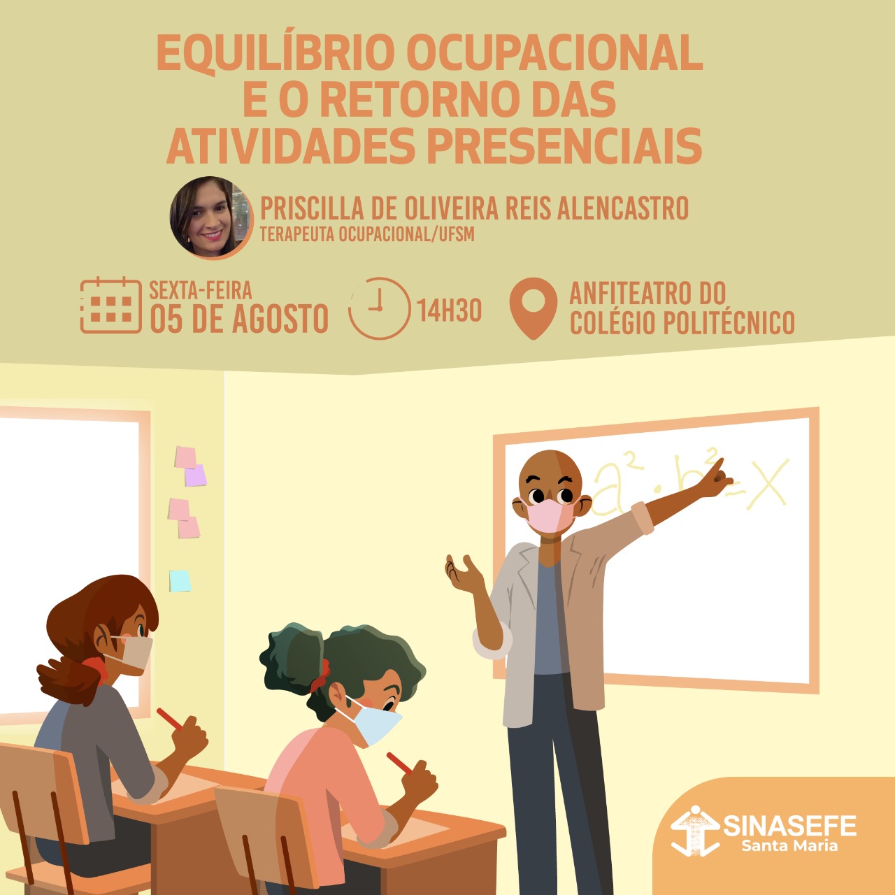 É pensando nessas inquietudes e angústias ainda presentes na categoria que o Sinasefe Santa Maria promove, nesta sexta-feira, 5 de agosto, a palestra “Equilíbrio ocupacional e o retorno das atividades presenciais”.