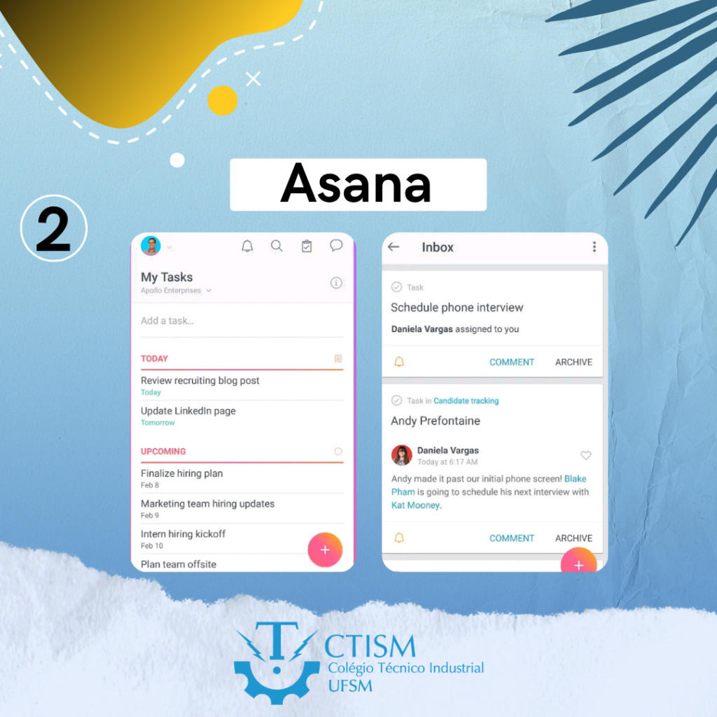 O Asana é um aplicativo disponível para aparelhos com o sistema operacional iOS e Android, onde é possível relacionar atividades, separá-las por temas e criar um calendário completo de estudos. Também tem a possibilidade de gerenciar as atividades e mudar seus status cada vez que você progredir nos estudos.