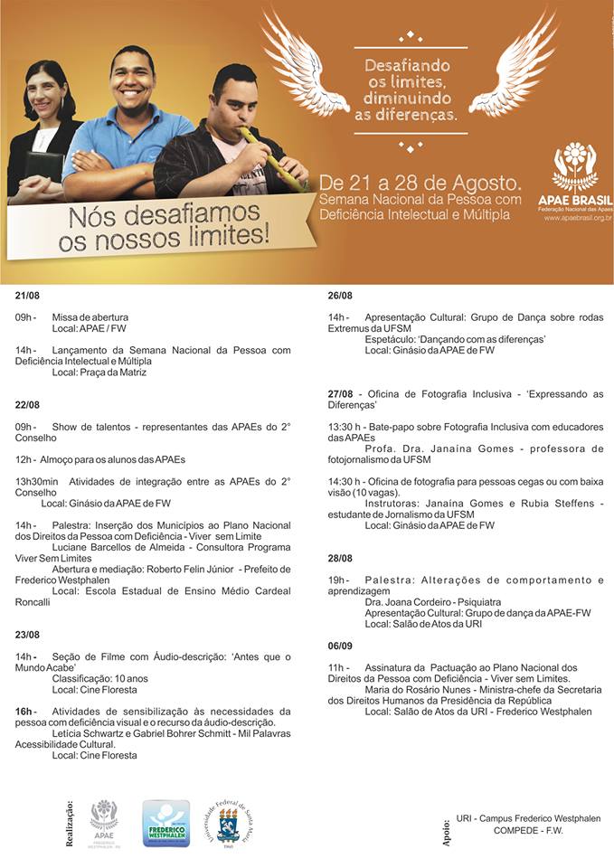 Com o tema: “Desafiando Limites: diminuindo as diferenças”, a Semana Nacional da Pessoa com Deficiência Intelectual e Múltipla de 2013 marca a parceria entre a APAE, Associação dos Pais e Amigos dos Excepcionais, a UFSM/FW e a administração municipal, por meio da Secretaria de Assistência Social e Habitação, na organização das atividades entre os dias 21 a 28 de agosto, com apoio com da URI – campus Frederico Westphalen e do COMPEDE-FW.