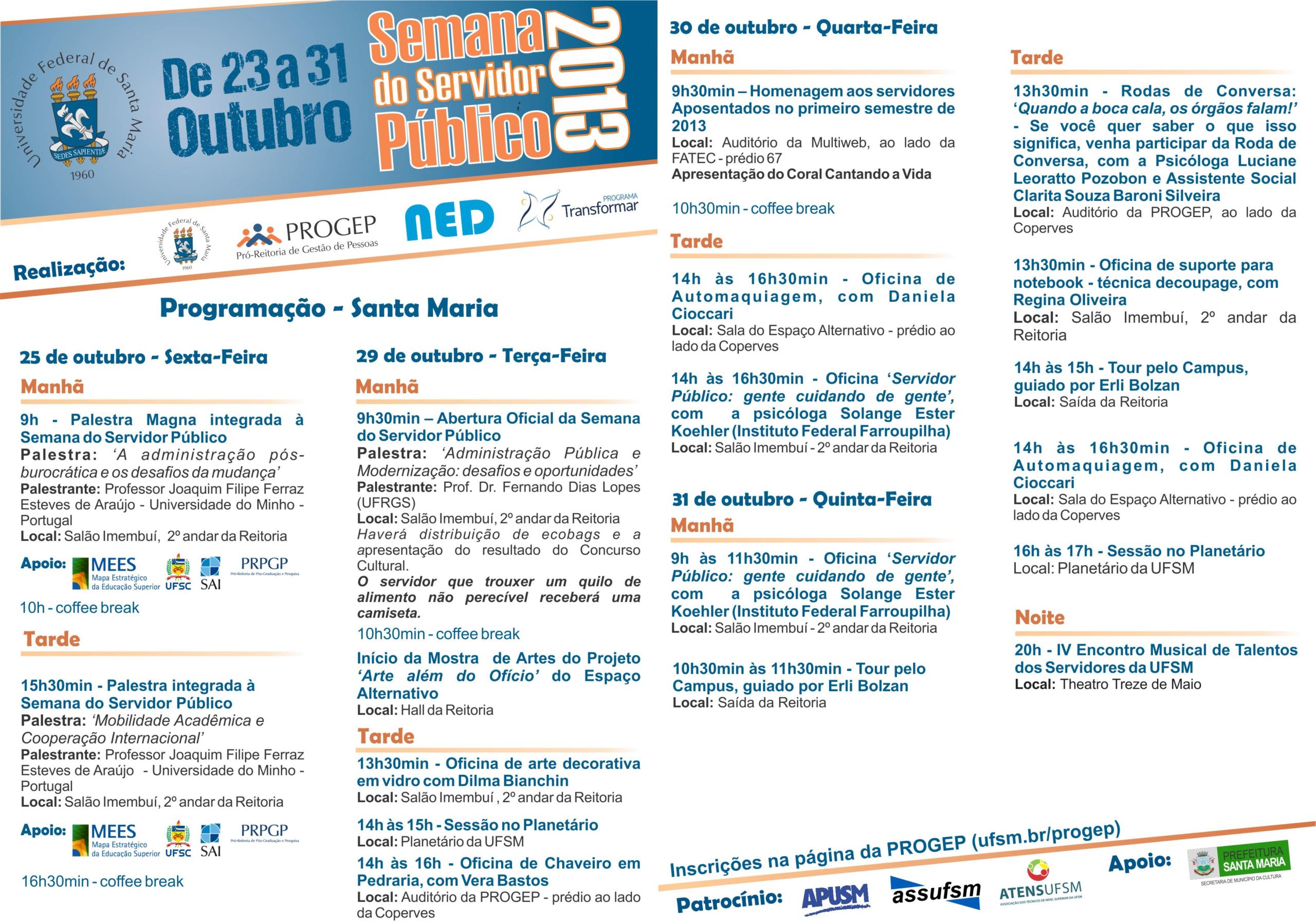 As inscrições para todas as atividades que integram a programação da Semana do Servidor Público 2013 estão abertas na página da PROGEP (www.ufsm.br/progep).