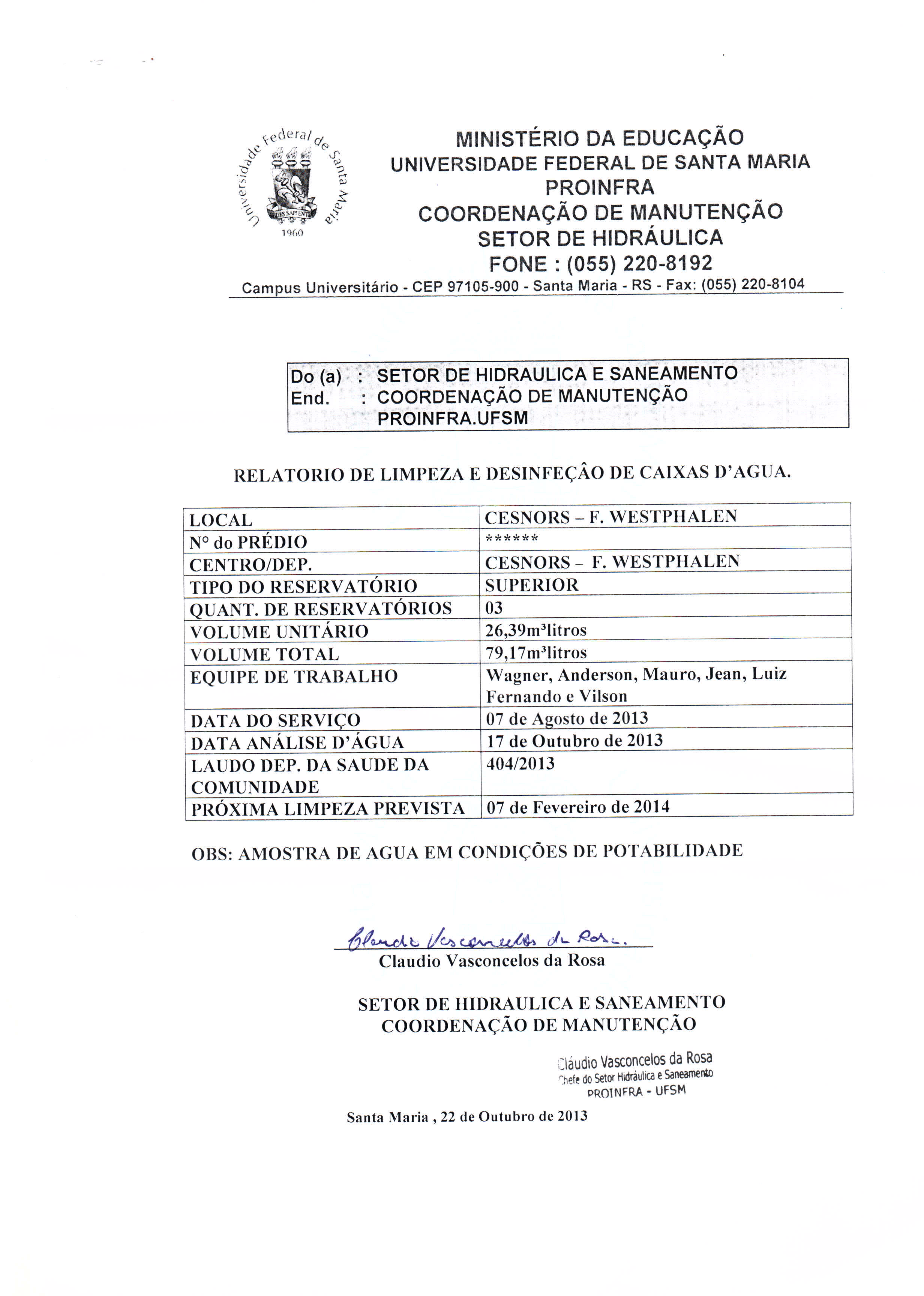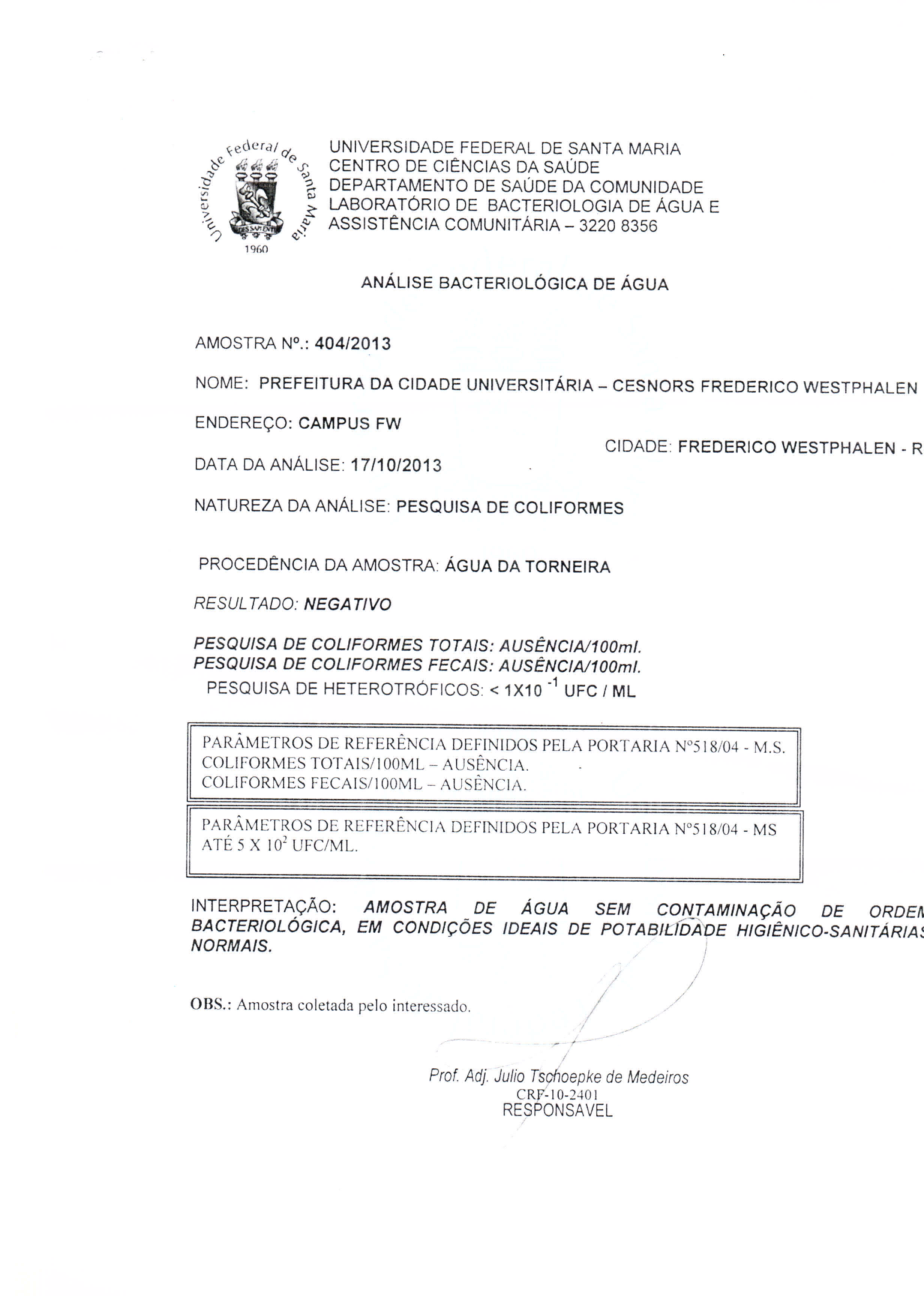 Análise bacteriológica da aguá realizada na UFSM campus Frederico Westphalen tem resultados divulgados pelo Setor de Hidráulica e Saneamento da Coordenação de Manutenção da PROINFRA. A amostra coletada foi classificada como em condições ideais de potabilidade higienico-sanitárias normais e sem qualquer tipo de contaminação de ordem bacteriológica, tendo assim ausência de coliformes totais e fecais dentro do parâmetro de referências definidos. Este exame será realizado no período de seis em seis meses pela equipe da Pró-Reitoria de Infraestrutura.