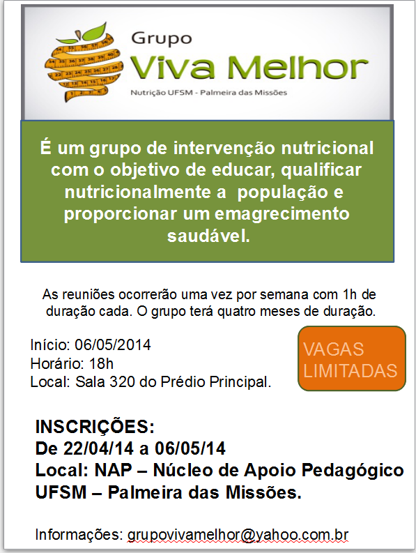 Inscrições: entre os dias 22 de abril a 6 de maio no Núcleo de Apoio Pedagógico (1º prédio, próximo à entrada) da UFSM campus Palmeira das Missões (das 8:00 às 12:00 e das 13:00 às 17:30 horas) ou pelo e-mail grupovivamelhor@yahoo.com.br.