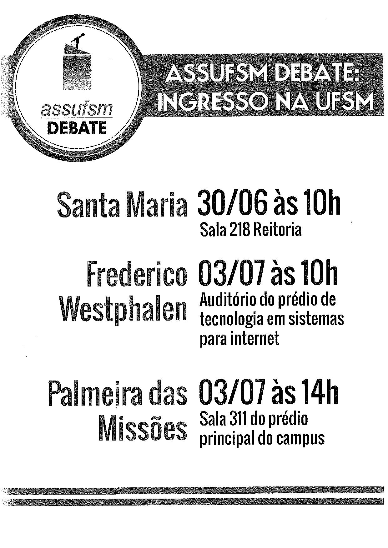 A Coordenação da ASSUFSM-Seção Sindical/RS convida os técnicos administrativos, docentes e estudantes do Centro de Educação Superior Norte RS para o debate “Ingresso na UFSM”, que será realizado no dia 03 de Julho, às 10 horas, no auditório do Prédio de Tecnologia em sistemas para Internet (CAFW) e às 14h, na sala 311 do Prédio Principal do campus Palmeira das Missões.