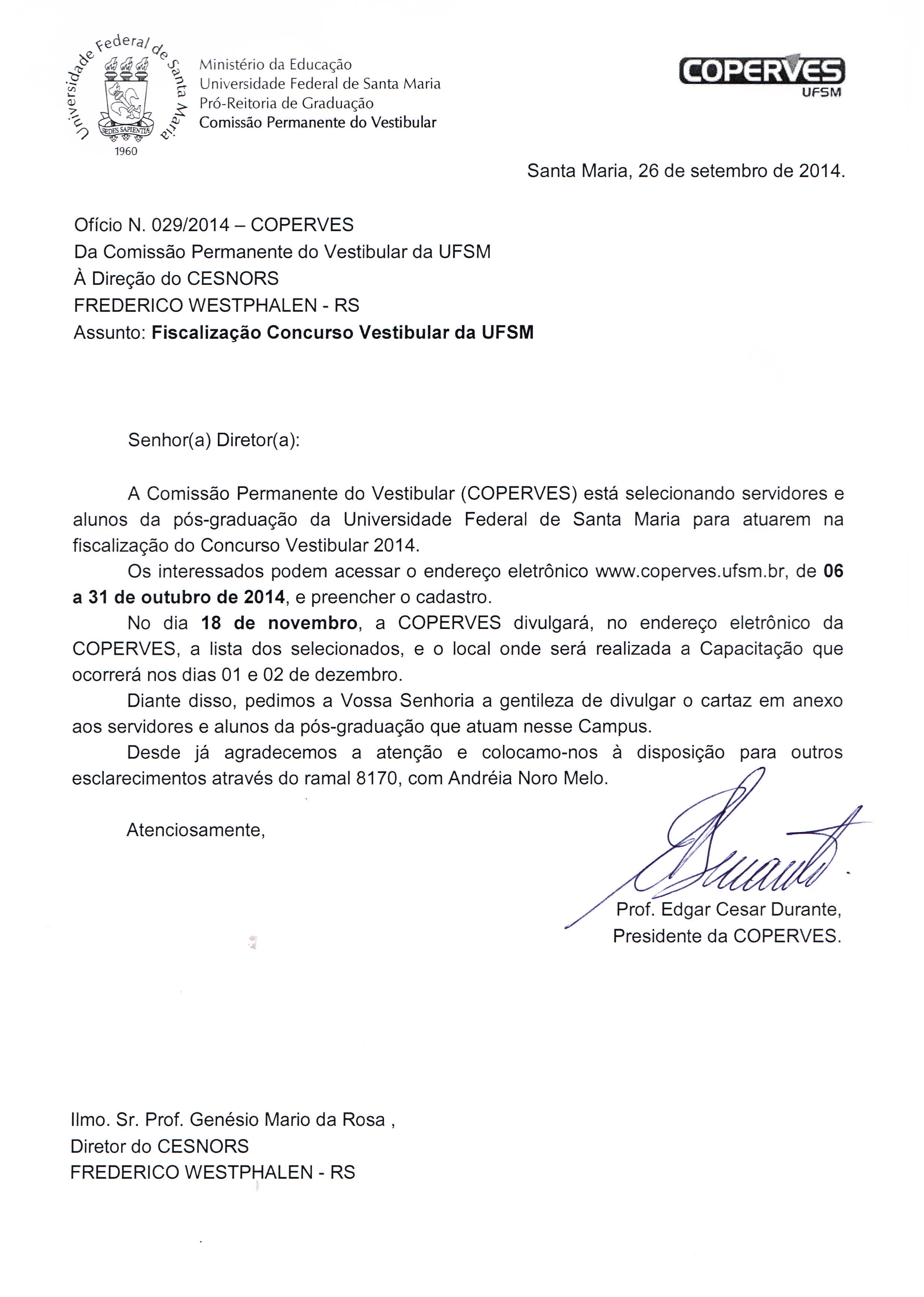 Para mais informações acesse o Ofício sobre a Fiscalização do Concurso Vestibular da UFSM.