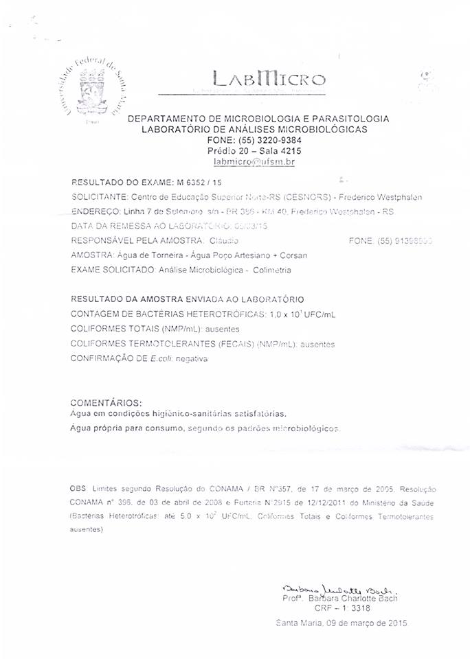 Segundo o resultado da análise microbiológica de colimetria da água, do campus Frederico Westphalen, recebida na última semana pelo Laboratório de Análises Microbiológicas, a água está em condições higiênicas adequadas e própria para consumo.