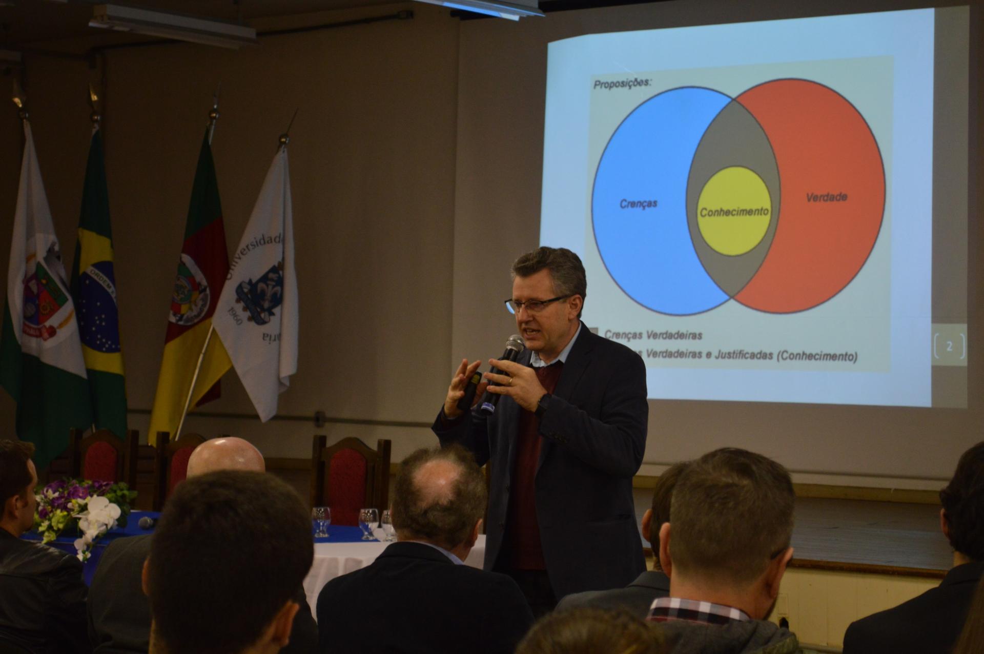 A primeira palestra da manhã teve como tema, “Conhecimento científico: fortalecendo a interface entre a universidade e a região” com o professor Odir Antônio Dellagostin, Diretor-presidente da FAPERGS, que demonstrou os números de doutores do RS e também informou a todos os presentes que o estado do Rio Grande do Sul é responsável por  11% em toda a pesquisa produzida no Brasil.
