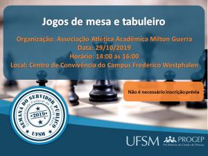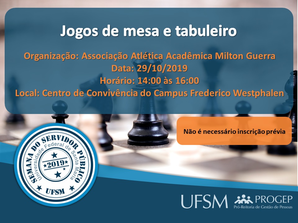 A Semana do Servidor Público da UFSM-FW deste ano contará com atividades dos dias 29 de outubro a 04 de novembro. Atividades como palestras, jogos de mesa, sessão de cinema e café compartilhado. As atividades são voltadas para os servidores, docentes e técnicos, da UFSM.