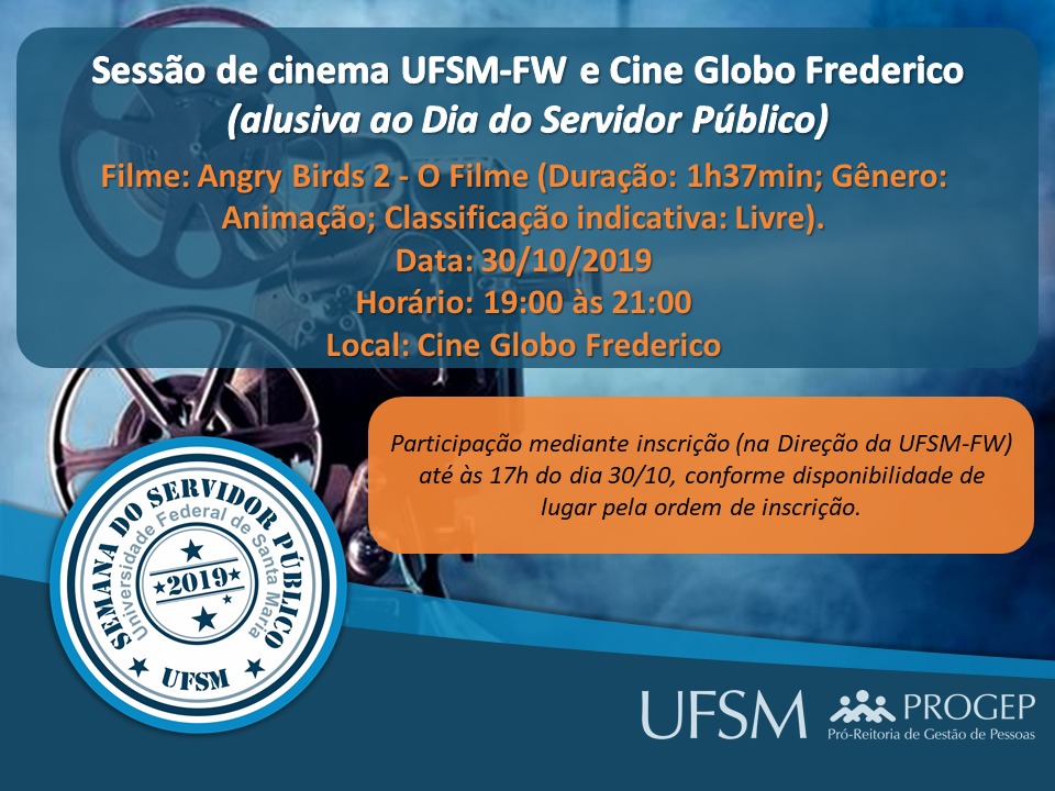 Uma oferta do Cine Globo Frederico para os servidores da UFSM-FW, extensível a companheiro(a) e filhos(as), mediante inscrição presencial na Direção da UFSM-FW até às 17h do dia 30 de outubro. A apresentação, na entrada do cinema, do Documento de Identidade inscrito será o ‘ingresso’ para a sessão.