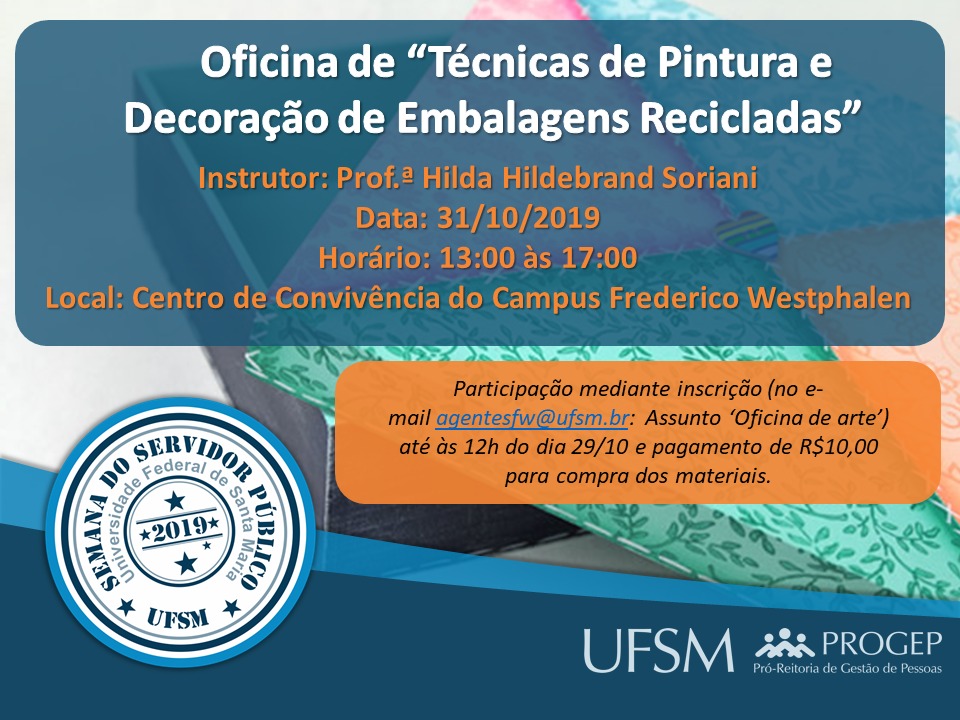 Inscrição pelo e-mail agentesfw@ufsm.br (Assunto: ‘Oficina de arte’) até às 12h do dia 29/10 e pagamento de R$10,00 para compra dos materiais.