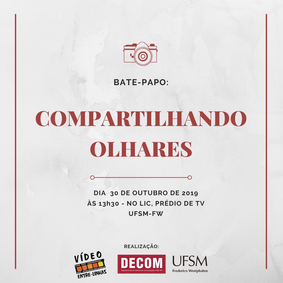 O bate-papo “Compartilhando Olhares”, desenvolvido pelas disciplinas de Introdução à Fotografia do Curso de Jornalismo e de Cinema e Sociedade e promovido pelo Departamento de Comunicação da UFSM-FW, terá sua primeira edição dia 30/10, às 13:30, no Laboratório de Informação Convergente da UFSM-FW. O evento tem apoio do Projeto “Vídeo Entre- Linhas: formação de jovens realizadores em Frederico Westphalen e região”.