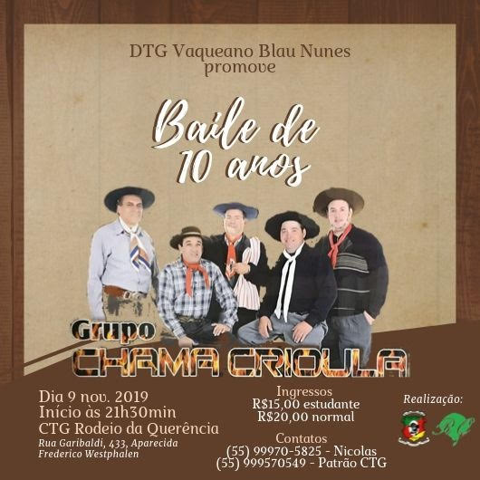 O DTG Vaqueano Blau Nunes, da UFSM-FW, promoverá no dia 09 de novembro um baile comemorativo aos seus 10 anos. Será realizado no CTG Rodeio da Querência,  a partir das 21h30.