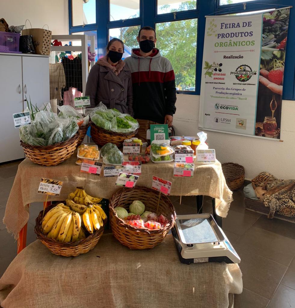 Na manhã do dia 19 de maio, ocorreu no hall do Prédio Principal da UFSM/FW a Feirinha Agroecológica, onde produtores agroecológicos de duas propriedades familiares da região, Sítio Pedras Brancas e Sítio das Amoras, comercializam alimentos agroecológicos.