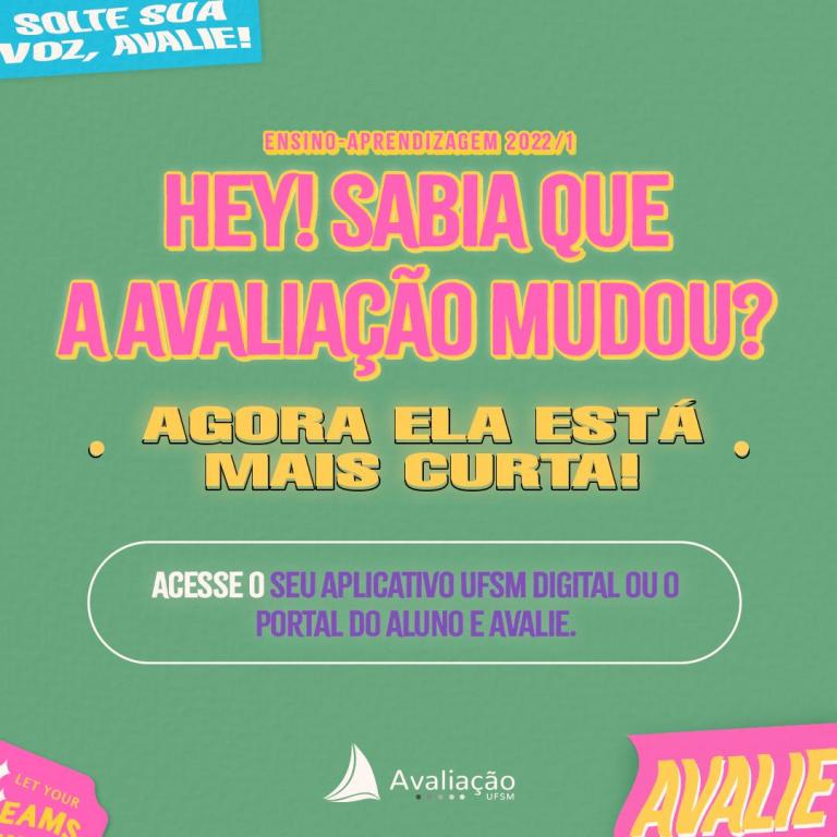 A fim de compreender a visão de discentes sobre o processo de ensino e aprendizagem, o período de avaliação das disciplinas do 1º semestre letivo de 2022., via Portal do Aluno, está aberto a partir de hoje (15) até o dia 21 de setembro. Neste momento, apenas alunos poderão participar do procedimento de análise das aulas.