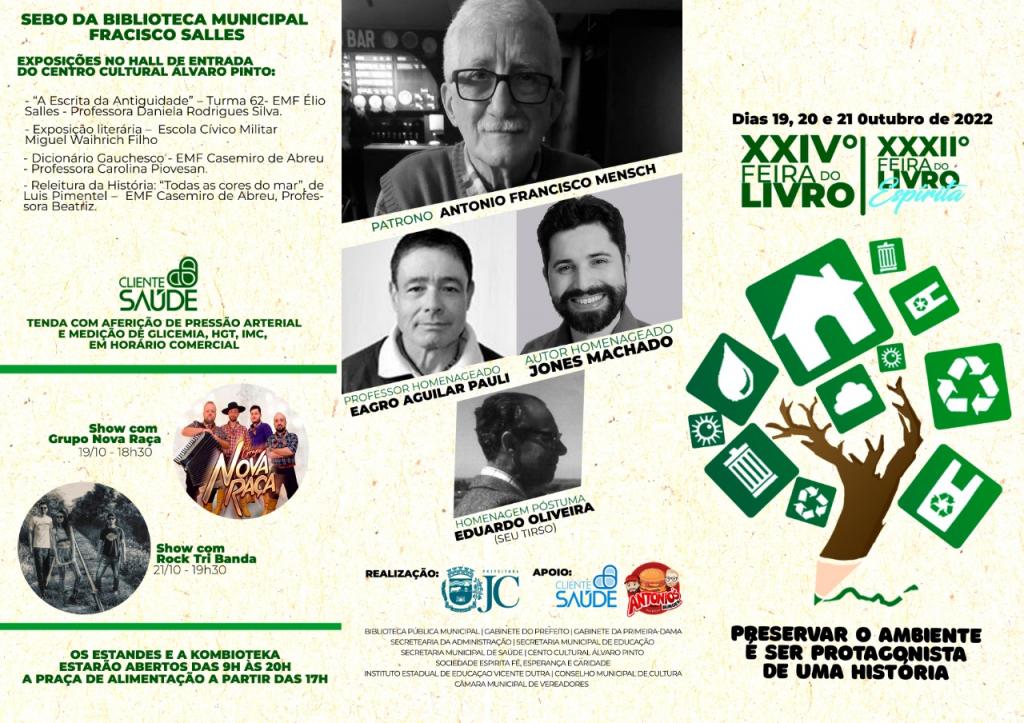 A 24ª Feira do Livro e 32ª Feira do Livro Espírita de Júlio de Castilhos (RS) contará com o Prof. Jones Machado, docente do Departamento de Ciências da Comunicação da UFSM Campus Frederico Westphalen como o Autor Homenageado deste ano. Nesta edição, o autor lançará seu 9º livro, sendo o primeiro do gênero infantil escrito por ele e intitulado “O novo mundo de Benjamin – Aqui fora é diferente” (2022), fruto do registro do autor sobre a trajetória de seu filho nascido prematuramente.