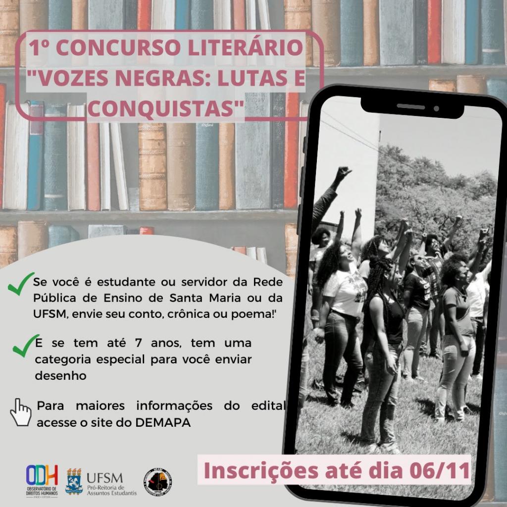 O Concurso é promovido pelo Observatório de Direitos Humanos (ODH-UFSM), Núcleo de Estudos Afro-Brasileiros e Indígenas (NEABI-UFSM) e Pró-Reitoria de Assuntos Estudantis (PRAE) e está com as inscrições abertas para estudantes e servidores da Rede Pública de Ensino de Santa Maria ou da Universidade Federal de Santa Maria.