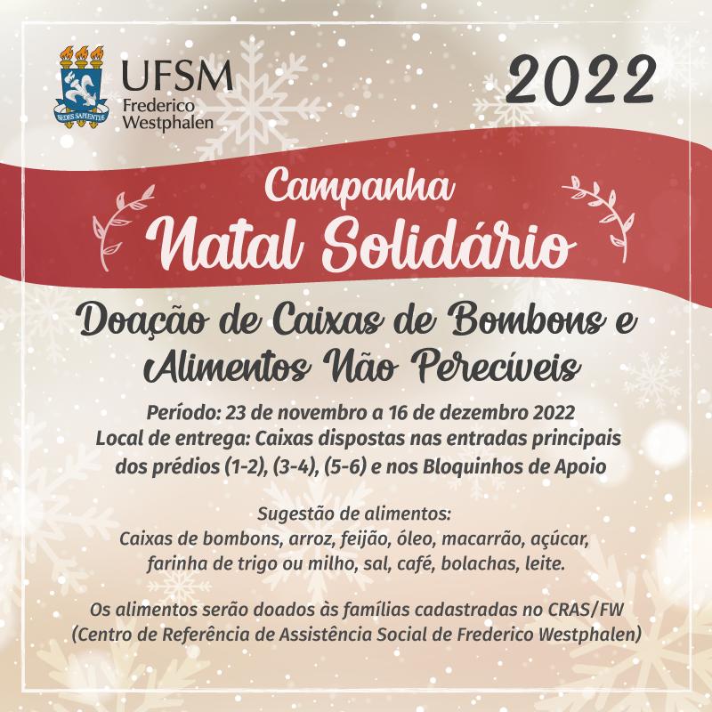 O Campus da Universidade Federal de Santa Maria, em Frederico Westphalen está promovendo a Campanha Natal Solidário – edição 2022, em parceria com o CRAS/FW (Centro de Referência de Assistência Social de Frederico Westphalen), órgão responsável pelos serviços de atenção básica de Assistência Social, no âmbito de Frederico Westphalen.