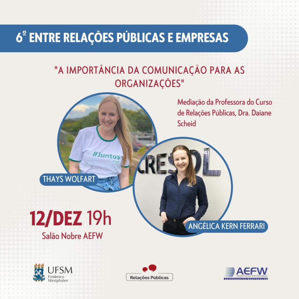 No próximo dia 12 de dezembro, às 19h, na Associação Empresarial de Frederico Westphalen (AEFW), ocorre o 6º Entre RP & Empresas, cujo tema é “A importância da comunicação para as organizações”. Para o painel, estão confirmadas as apresentações das relações-públicas Thays Wolfart (Sicredi) e Angélica Kern (Cresol), egressas da UFSM/FW e atuantes em cooperativas de crédito na cidade. A mediação estará a cargo da Profª Drª Daiane Scheid.