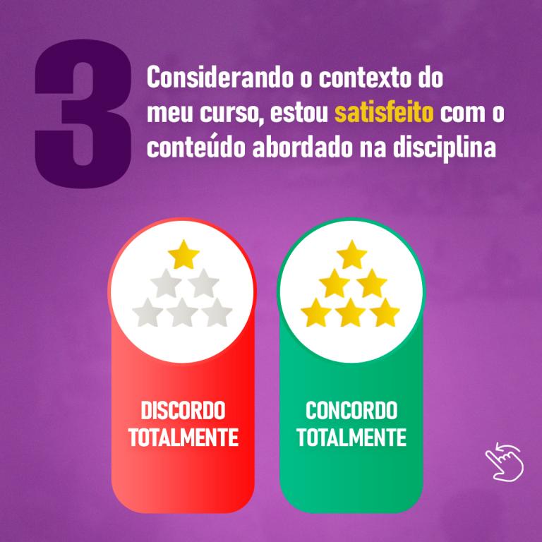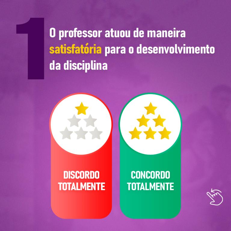 Desde a última edição, referente ao primeiro semestre de 2022, a avaliação está mais curta, com apenas três questões: o professor atuou de maneira satisfatória para o desenvolvimento da disciplina; as estratégias de ensino adotadas colaboraram para o alcance dos objetivos de aprendizagem; considerando o contexto do meu curso, estou satisfeito com o conteúdo abordado na disciplina. As respostas podem ser dadas numa escala que vai de “discordo totalmente” a “concordo totalmente”.