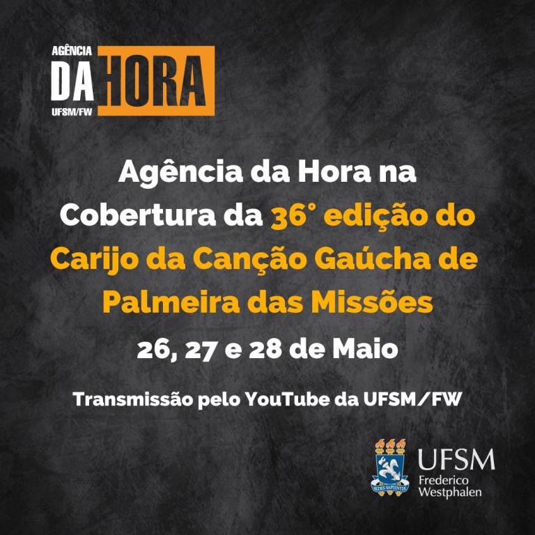 O projeto de Extensão da UFSM/FW Agência da Hora vai transmitir o 36° Carijo da Canção Gaúcha de Palmeira das Missões. A transmissão será no canal do YouTube da UFSM/FW nos dias 26, 27 e 28 de Maio a partir das 20h.