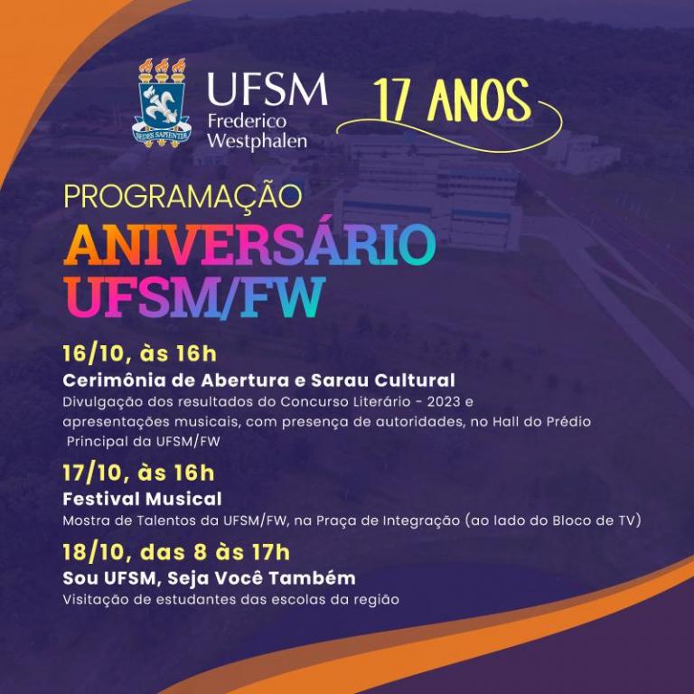 Para comemorar todos esses anos de trajetória, a UFSM/FW preparou uma programação, com eventos que acontecerão entre os dias 16 e 18 de outubro. No primeiro dia, às 16h, no Hall do Prédio Principal, haverá a Cerimônia de Abertura, com a presença de autoridades, e o Sarau Cultural, no qual serão divulgados os resultados do Concurso Literário que foi promovido pela Comissão de Cultura e Arte do Campus, com o tema “As lembranças que eu tenho da UFSM/FW”, e, ocorrerão apresentações musicais. No segundo dia, será promovida a Mostra de Talentos Musicais da UFSM/FW, a partir das 16h, na Praça de Integração. Nessa Mostra, os participantes poderão exibir seu talento ao cantar e/ou tocar algum instrumento. Já no terceiro dia o Projeto Institucional SEJA UFSM/FW realizará a 2ª edição do evento “Sou UFSM/FW, Seja Você Também!”.