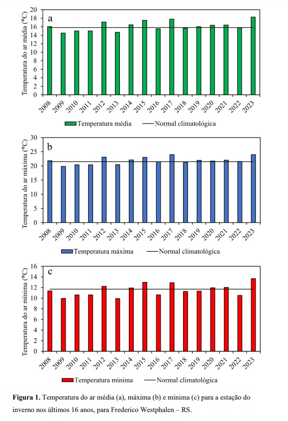 De acordo com estudo realizado, durante a estação do inverno, a temperatura do ar teve uma variação de 9,9 a 23,9°C, registrando uma amplitude, de forma geral, de 14,1°C e obtendo uma temperatura média de 16,4°C, ficando 0,7°C acima da normal climatológica. Observando-se a temperatura do ar por ano, 2023 pode ser considerado o inverno mais quente dos últimos 16 anos para Frederico Westphalen – RS. A estação meteorológica registrou uma temperatura do ar média de 18,3°C para esse período, ficando 2,5°C acima da normal climatológica.