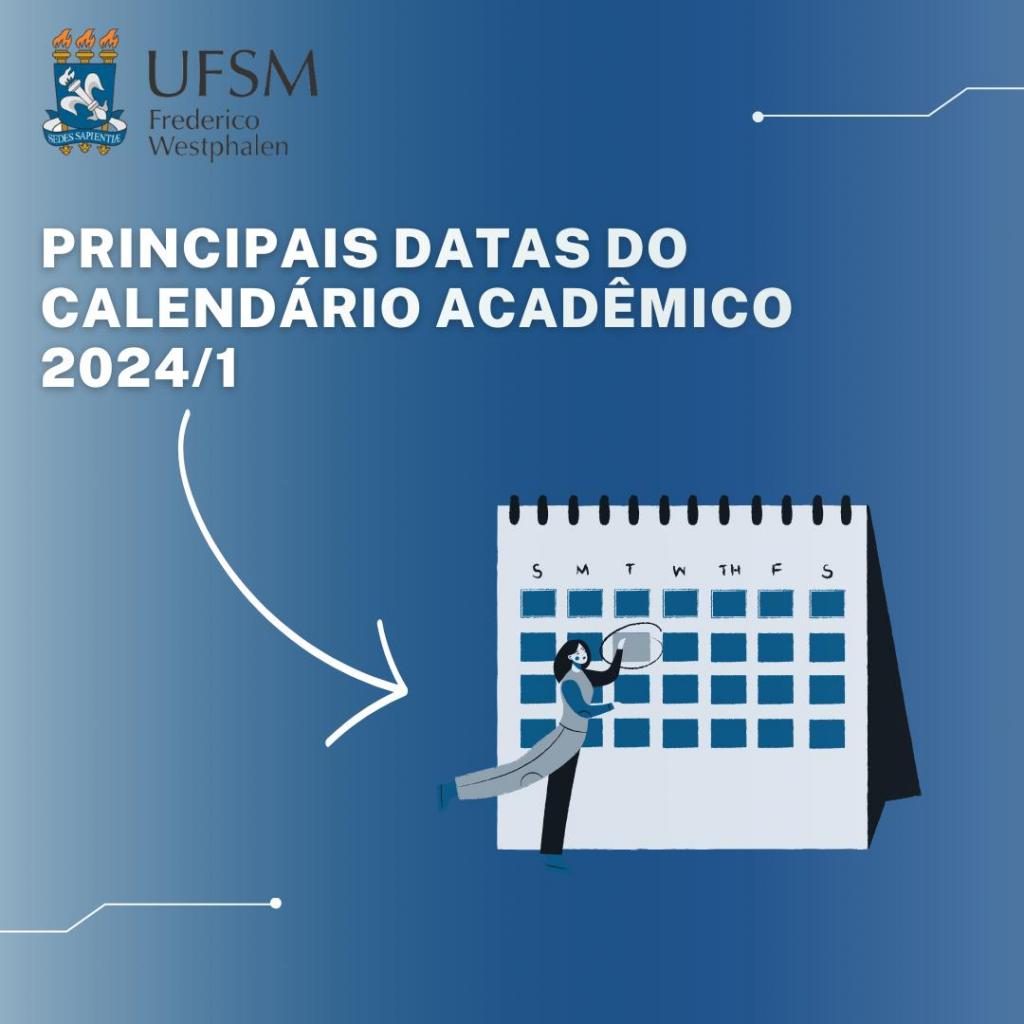 Estas são as datas mais importantes do primeiro semestre de 2024 para os estudantes de Graduação e de Pós-Graduação. Outras datas referentes ao calendário acadêmico de 2024 podem ser encontradas no site da UFSM, através deste link: https://www.ufsm.br/calendario/2024-64678