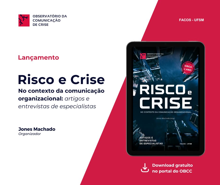 O e-book “Risco e Crise no Contexto da Comunicação Organizacional: artigos e entrevistas de especialistas”, comemorativo ao primeiro ano de implementação do Observatório da Comunicação de Crise (OBCC), está sendo lançado hoje e encontra-se disponível para download gratuito no portal do OBCC. O livro é composto pelos principais conteúdos publicados no portal e organizados pelo Prof. Dr. Jones Machado, Coordenador-Geral do OBCC.