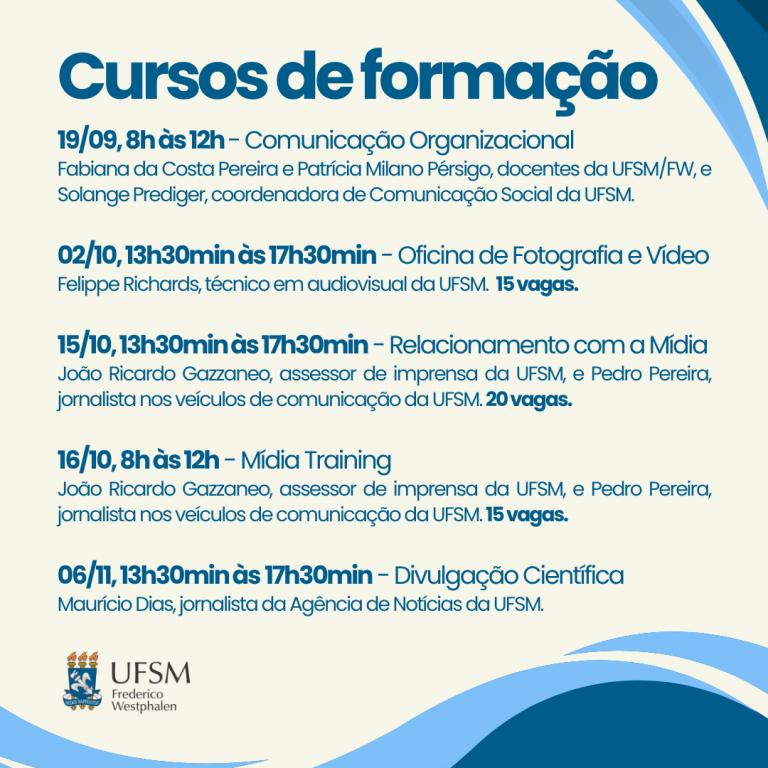 Os cursos de formação têm início no dia 19 de setembro, com o primeiro encontro: “Comunicação Organizacional”, ministrado pelas docentes da UFSM/FW Fabiana da Costa Pereira e Patrícia Milano Pérsigo, e pela coordenadora de Comunicação Social da UFSM, Solange Prediger.