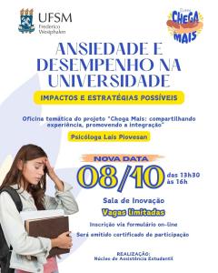 O Núcleo de Assistência Estudantil (NAE) do Campus da Universidade Federal de Santa Maria em Frederico Westphalen (UFSM/FW), por meio do projeto “Chega Mais: compartilhando experiências, promovendo a integração”, realiza, às 13h30min do dia 08 de outubro (quarta-feira), a oficina “Ansiedade e desempenho na universidade: impactos e estratégias possíveis”, na Sala de Inovação do Campus.