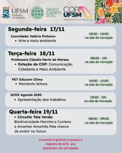 A programação ocorrerá, em sua totalidade, na sala de inovação da UFSM/FW e conta com atividades que conectam arte, comunicação, cidadania e meio ambiente. Na segunda-feira (17), às 13h30, a convidada artista plástica Valéria Pinheiro abre o evento com a palestra “Arte e meio ambiente”. Na terça-feira (18), às 8h30, a professora Cláudia Herte de Moraes conduz as apresentações de trabalhos da disciplina de Comunicação, Cidadania e Meio Ambiente, seguidas pelo PET Educom Clima, que realiza um Momento Leitura. À tarde, às 13h30, a DCEX Agenda 2030 realiza as apresentações de trabalhos. Na quarta-feira (19), 8h30, acontece o Circuito Tela Verde, com exibições e discussões dos curtas “Biodiversidade marinha e costeira” e “Amanhã Amanhãs: Pela chance de existir no futuro”.