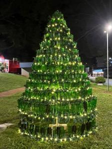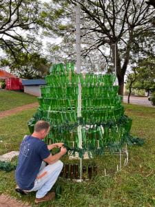 A árvore, confeccionada com cerca de 700 garrafas, está instalada no tradicional Ecoponto da URI, um dos principais pontos de entrega voluntária de vidro no município. O local foi escolhido por unir visibilidade pública, fluxo constante de descarte e a oportunidade de integrar a ação à decoração natalina, fortalecendo a educação ambiental por meio da estética.