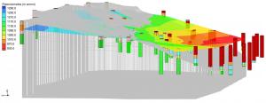 A imagem associada ao estudo ilustra os tipos de rocha que compõem a base do talude da cava. As áreas em cinza representam as principais formações rochosas da região. Os cilindros coloridos indicam os locais onde foram realizadas perfurações para investigar o interior da rocha, mostrando diferentes níveis de alteração. Já a superfície colorida que atravessa o maciço rochoso representa o nível da água subterrânea nas partes mais profundas, calculado com base no nível médio do mar.