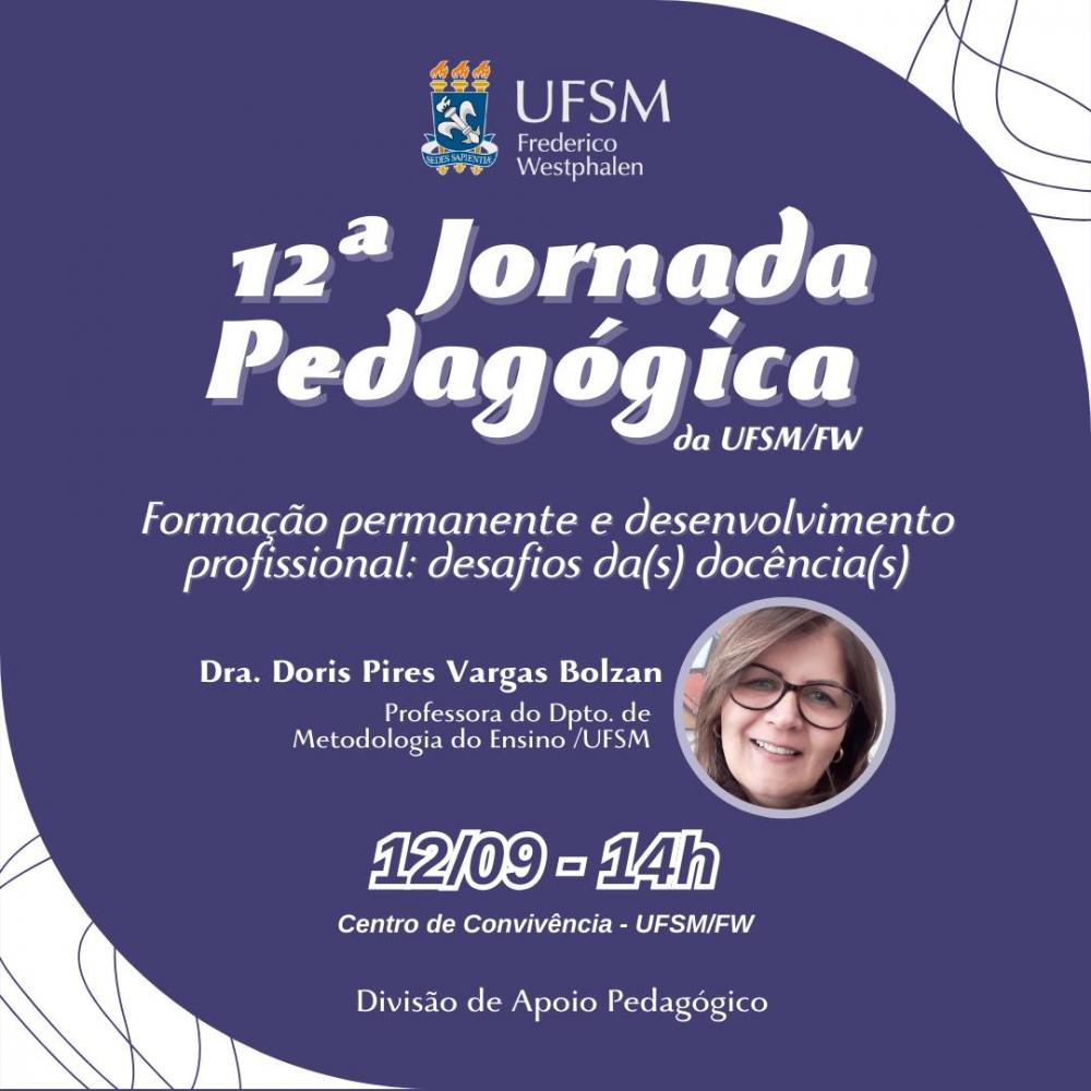 A Divisão de Apoio Pedagógico (DAP) e a Coordenadoria Acadêmica convidam para a 12ª Jornada Pedagógica da UFSM/FW, na qual haverá a fala da Dr.ª Doris Pires Vargas Bolzan, Professora de Metodologia do Ensino da UFSM, intitulada “Formação Permanente e desenvolvimento profissional: desafios da(s) docência(s)”. A Prof.ª Doris dará continuidade às temáticas abordadas nas últimas Jornadas, tendo em vista o feedback positivo e as sugestões apontadas nas avaliações.