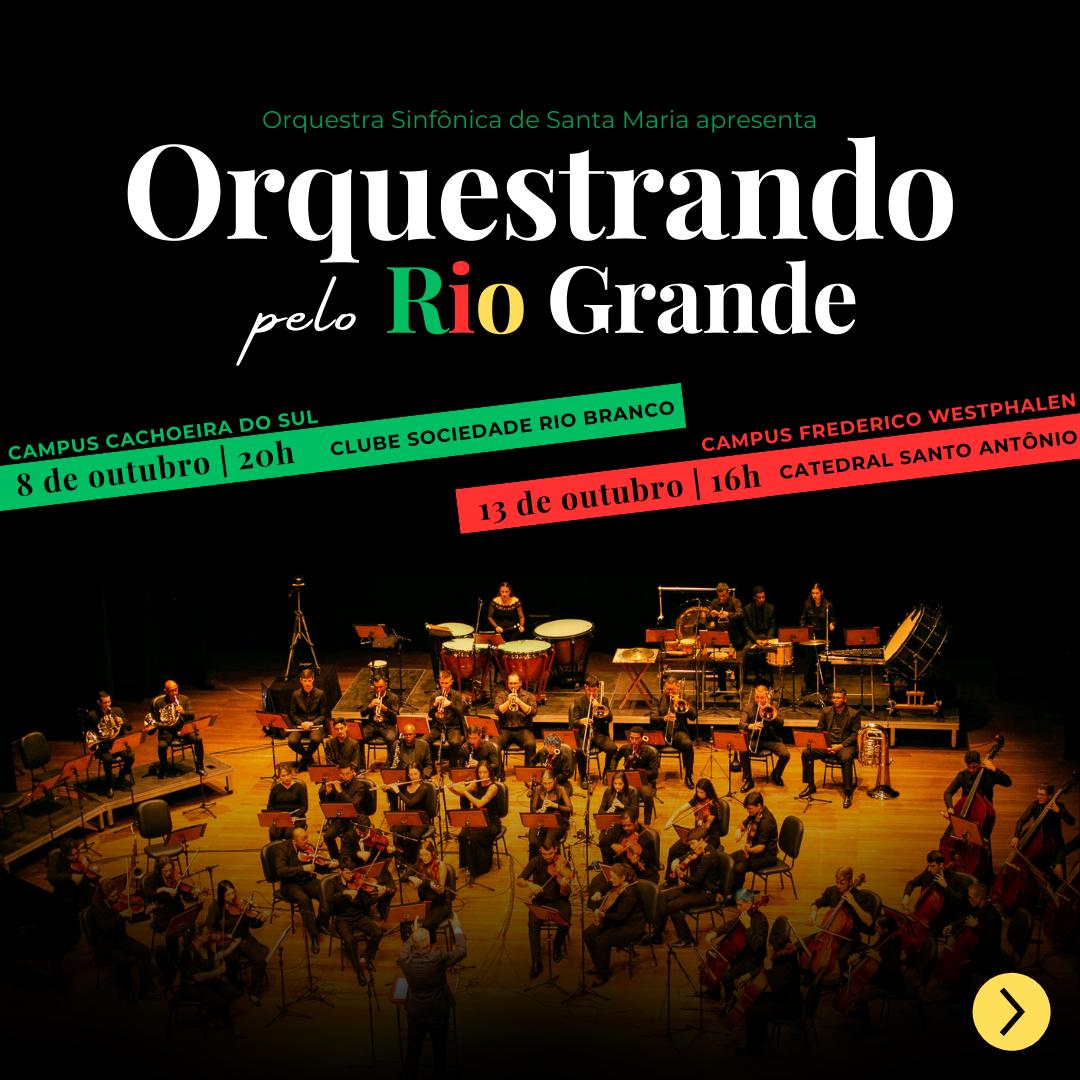 A Orquestra Sinfônica de Santa Maria e o Campus da UFSM/FW convidam para o Concerto com o título de “Orquestrando pelo Rio Grande”, com a regência do maestro João Batista Sartor. Serão apresentados os dois primeiros movimentos da 9ª sinfonia de Beethoven – obra que a orquestra tocou na íntegra no final de setembro, em dois concertos realizados em conjunto com a Filarmônica da Universidade Federal do Rio Grande do Sul. Depois o programa segue com a apresentação das danças do balé Estancia, do compositor argentino Alberto Ginastera, e do Danzón Nº 2, do mexicano Arturo Márquez. O público poderá assistir ao espetáculo gratuitamente. Porém, como se aproxima o Dia da Criança, a Orquestra Sinfônica de Santa Maria solicita a doação de brinquedos momentos antes da apresentação.