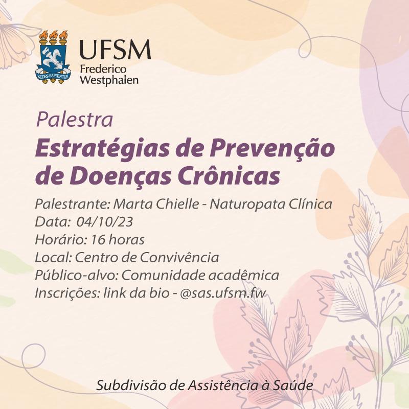 Convidamos a comunidade acadêmica da UFSM/FW para a palestra “Estratégias de Prevenção de Doenças Crônicas”.