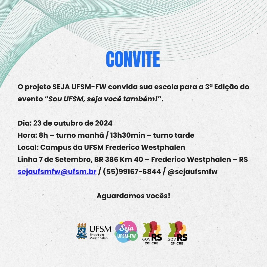 O Projeto SEJA UFSM-FW convida para a 3a Edição do Evento “Sou UFSM, Seja você também”, que terá como público-alvo estudantes de Ensino Médio das escolas de Frederico Westphalen e região, com o objetivo de conhecerem as estruturas do Campus, os nossos Cursos de Graduação, as formas de ingresso e permanência. Durante a visitação, os(as) estudantes poderão vivenciar momentos de trocas de experiências com professores(as) e acadêmicos(as) da UFSM/FW, por meio de oficinas e tirar dúvidas sobre cada curso. O evento contará com o apoio da Direção, Coordenadoria Acadêmica, Coordenações de Curso e 20ª Coordenadoria Regional de Educação.
