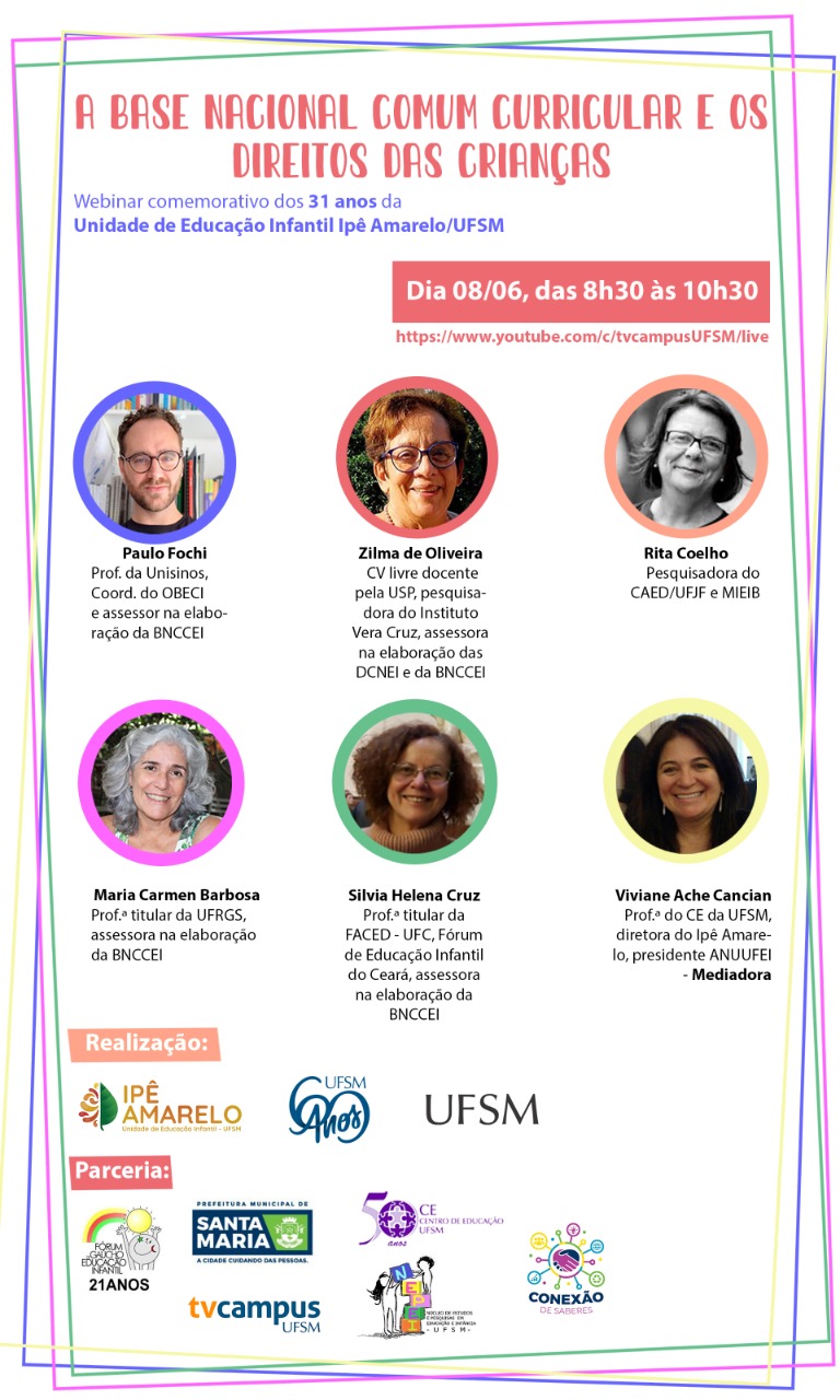A Unidade de Educação Infantil Ipê Amarelo, juntamente com a Universidade Federal de Santa Maria, e em parceria com o Fórum Gaúcho de Educação Infantil, a Prefeitura Municipal de Santa Maria, o Núcleo de Estudos e Pesquisas em Educação Infantil – NEPEI (UFSM), o Programa Conexão de Saberes, da Secretaria Municipal de Educação, a TV Campus – UFSM e o Centro de Educação da UFSM,  realizará, no dia 08 de junho, das 08:30 às 10:30, a Webinar comemorativa dos 31 anos da unidade, com o tema “A Base Curricular e os Direitos das Crianças”.