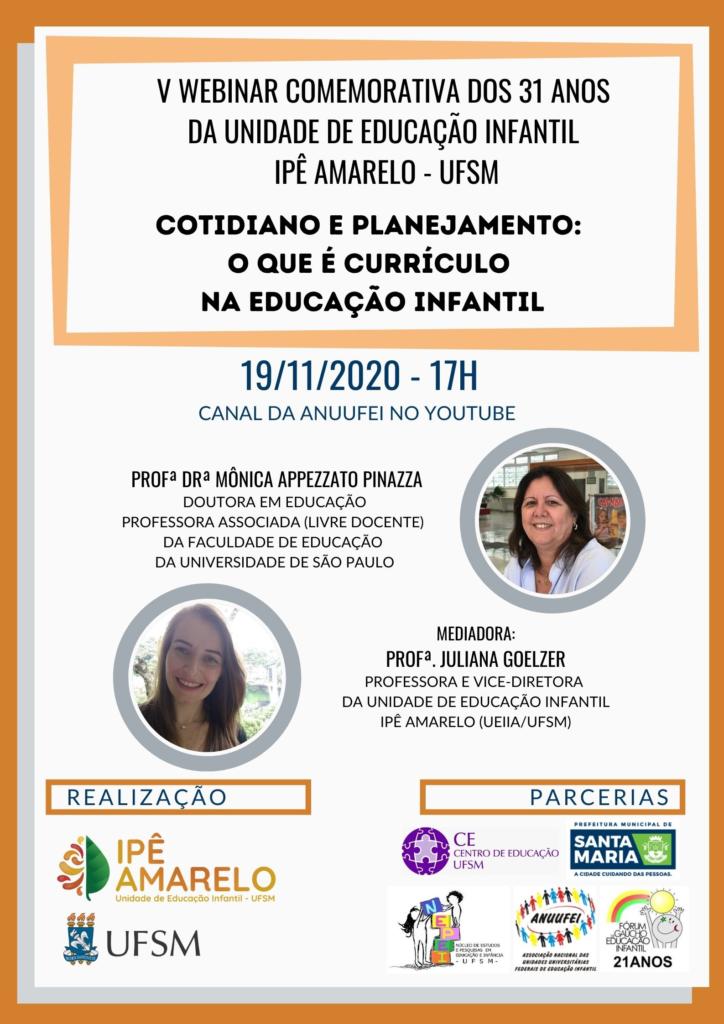 A Unidade de Educação Infantil Ipê Amarelo, juntamente com a Universidade Federal de Santa Maria, e em parceria com o Centro de Educação da UFSM, o Fórum Gaúcho de Educação Infantil, a Prefeitura Municipal de Santa Maria, o Núcleo de Estudos e Pesquisas em Educação Infantil – NEPEI (UFSM), e a Associação Nacional das Unidades Universitárias Federais de Educação Infantil – ANUUFEI,  realizará, no dia 19 de outubro, às 17:00h, a V Webinar comemorativa dos 31 anos da unidade, com o tema “Cotidiano e Planejamento: O que é currículo na Educação Infantil”.