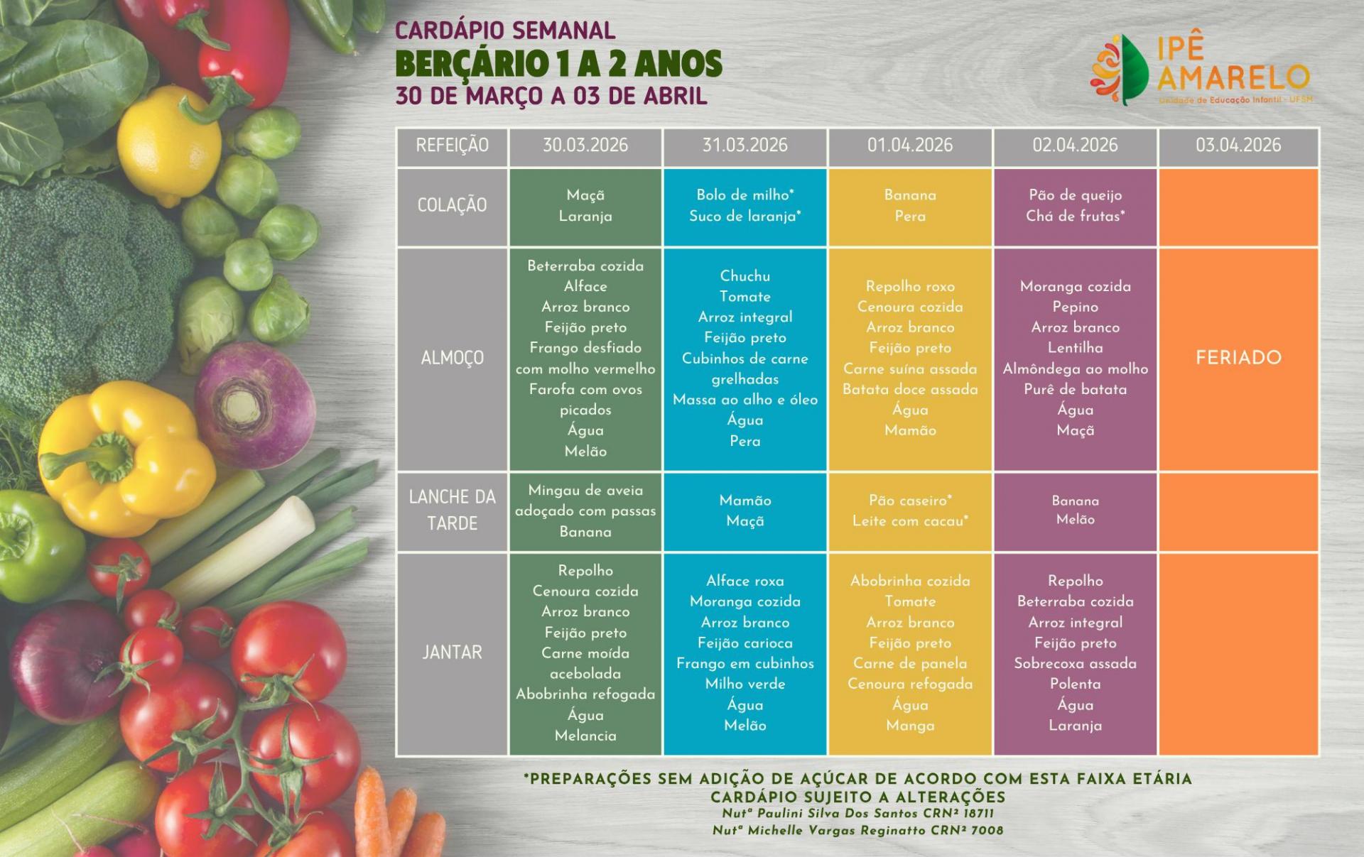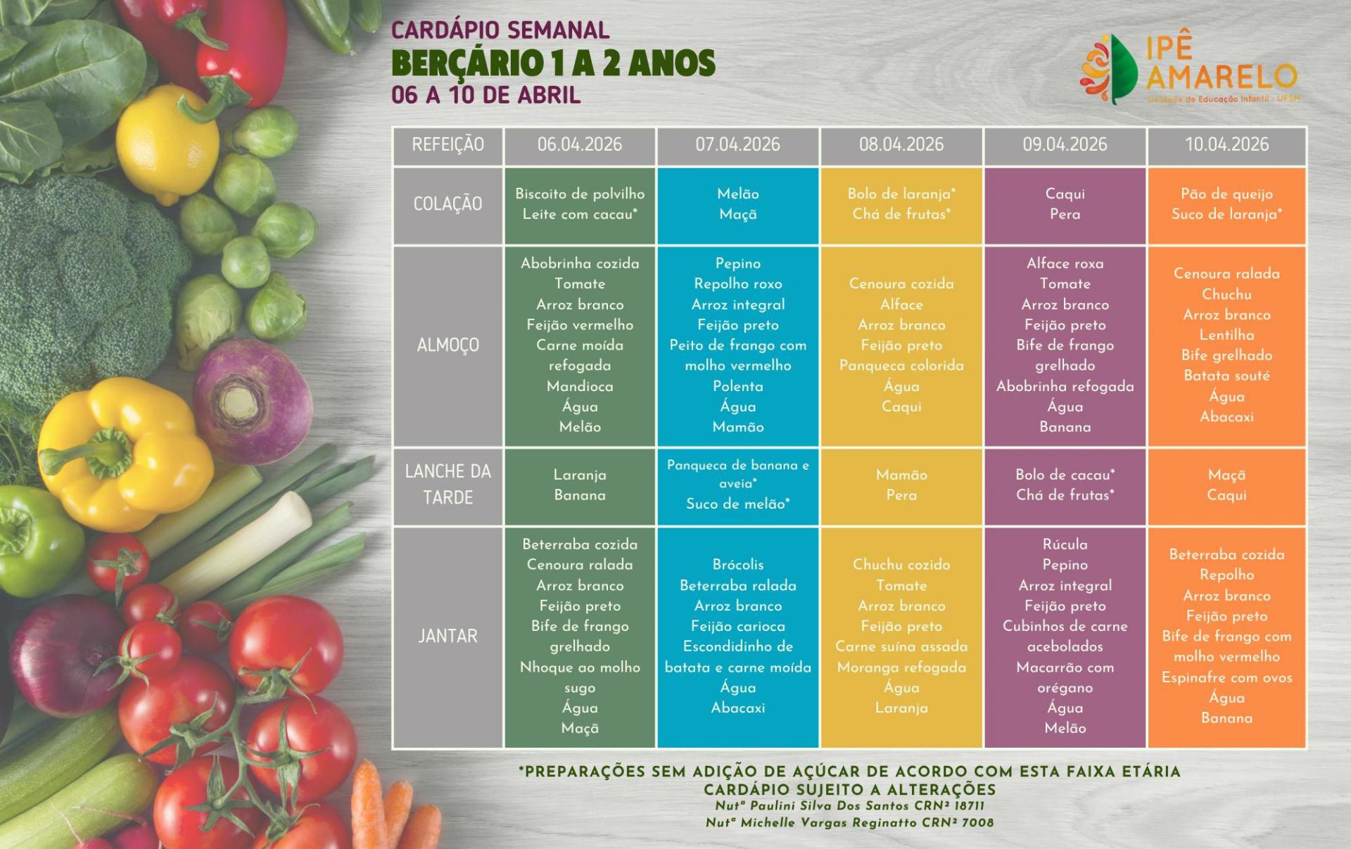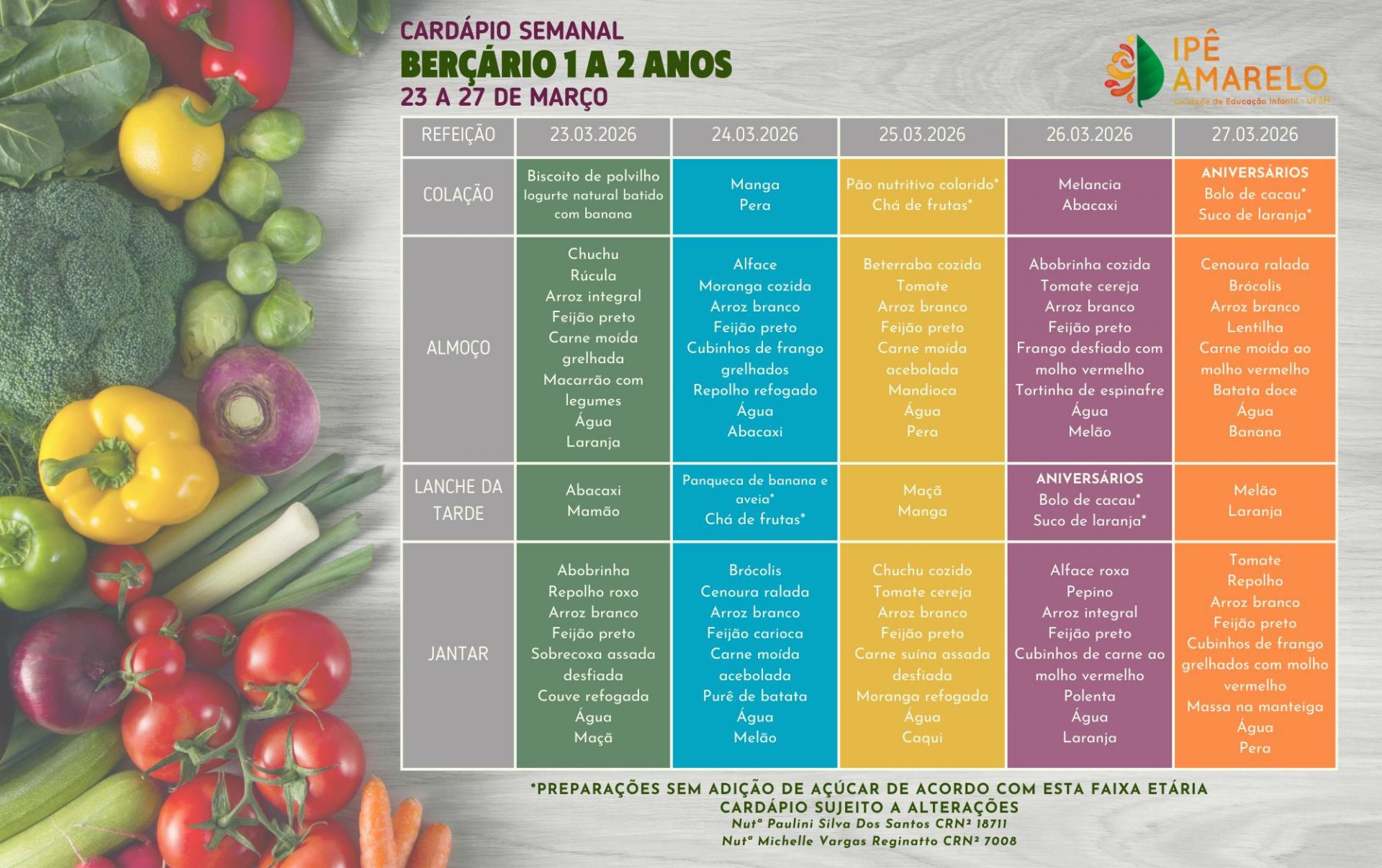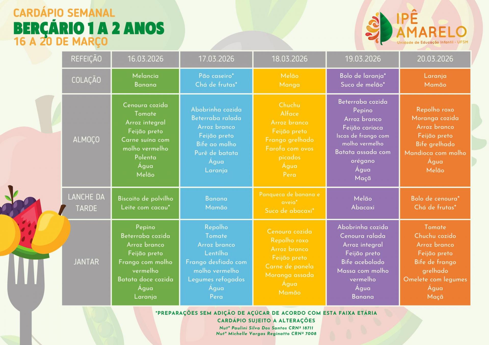 As refeições distribuídas nas turmas de berçário são servidas individualmente pelo cozinheiro e entregues aos professores, que distribuem às crianças. O cardápio destinado às crianças de 1 a 2 anos é composto por 5 refeições: colação, almoço, mamadeira, lanche da tarde e jantar.