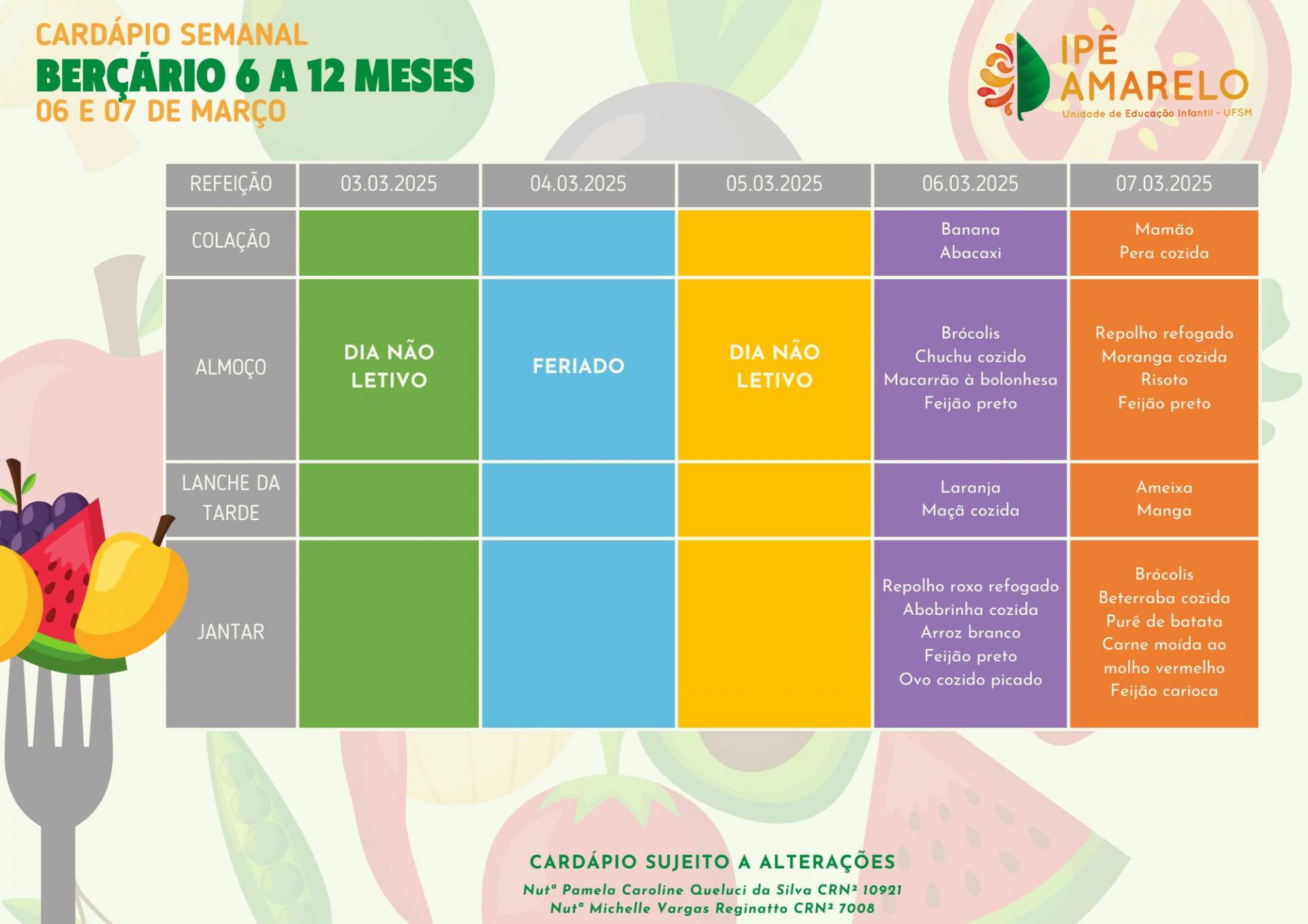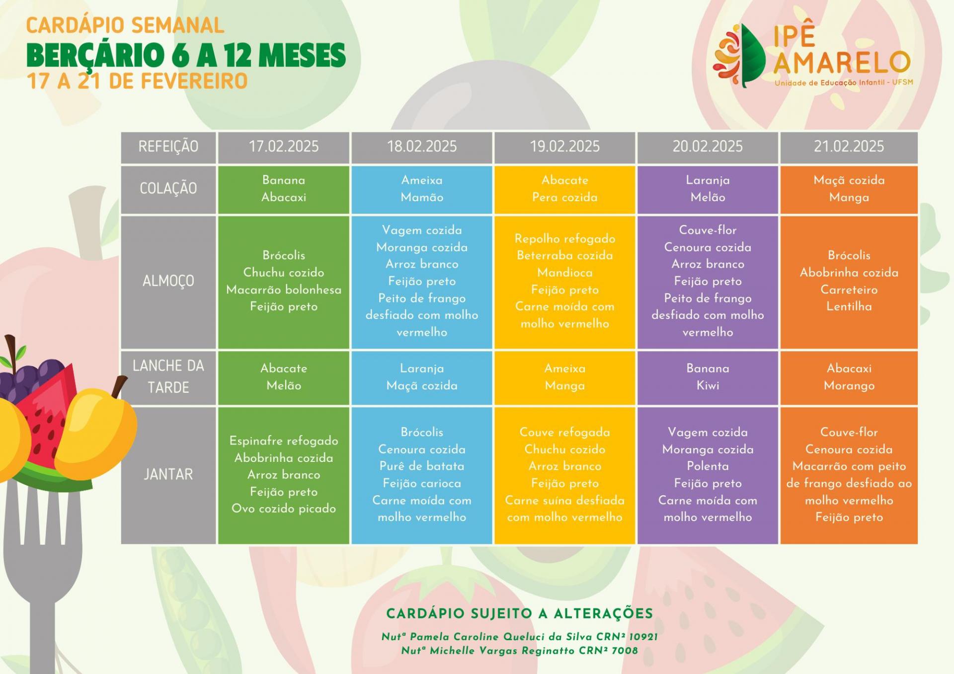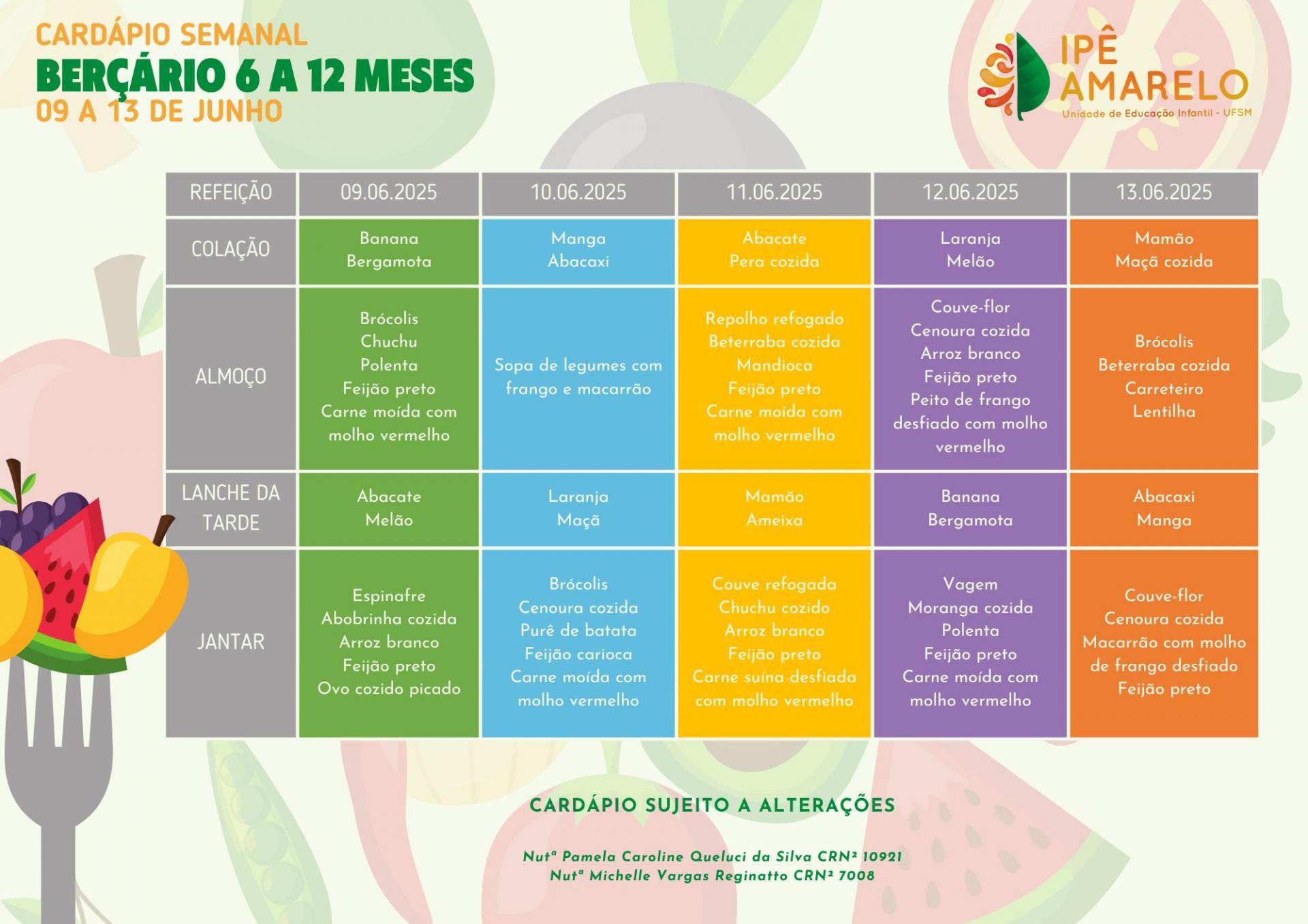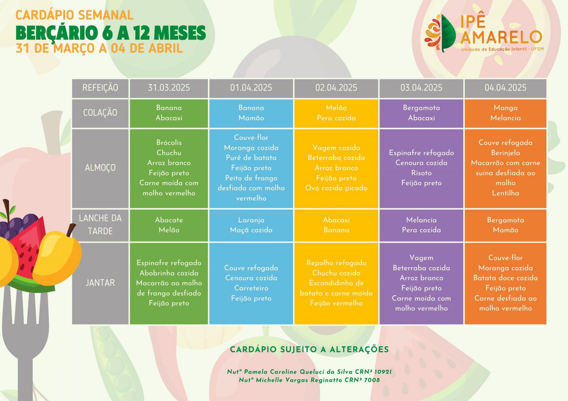 As refeições distribuídas nas turmas de berçário são servidas individualmente pelo cozinheiro e entregues aos professores, que distribuem às crianças. O cardápio destinado às crianças de 6 a 12 meses é composto por 5 refeições: colação, almoço, mamadeira (quando necessário), lanche da tarde e jantar.