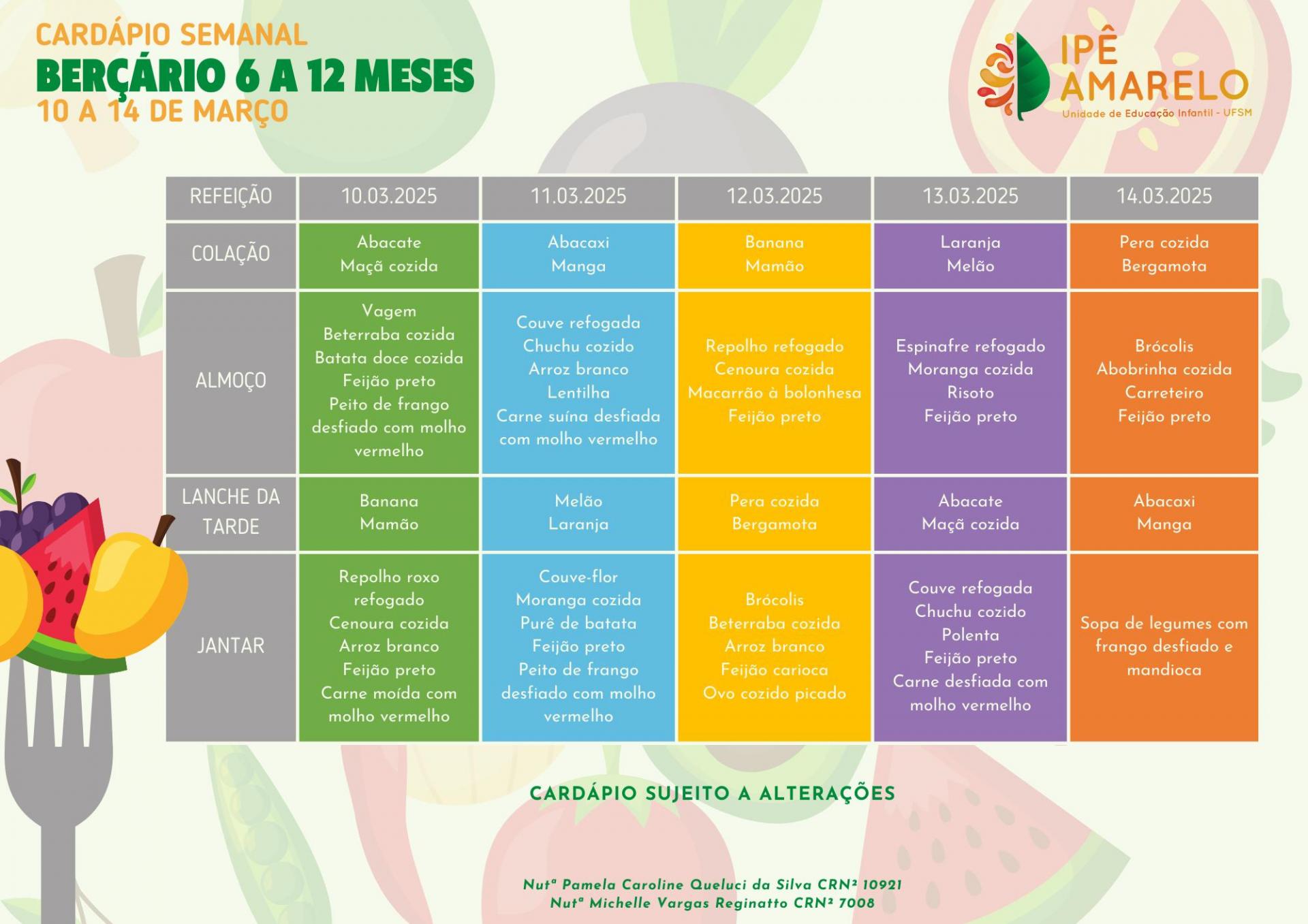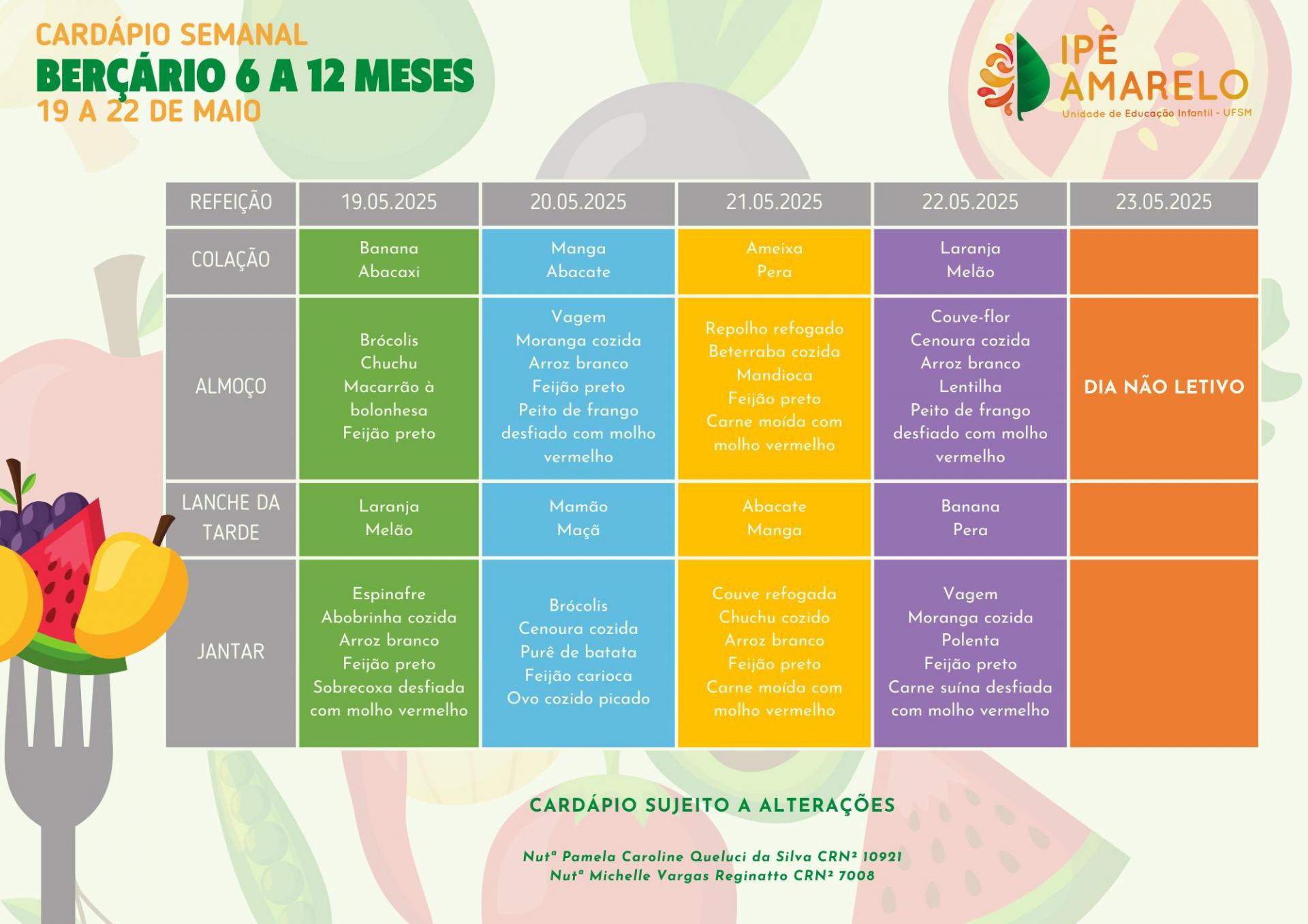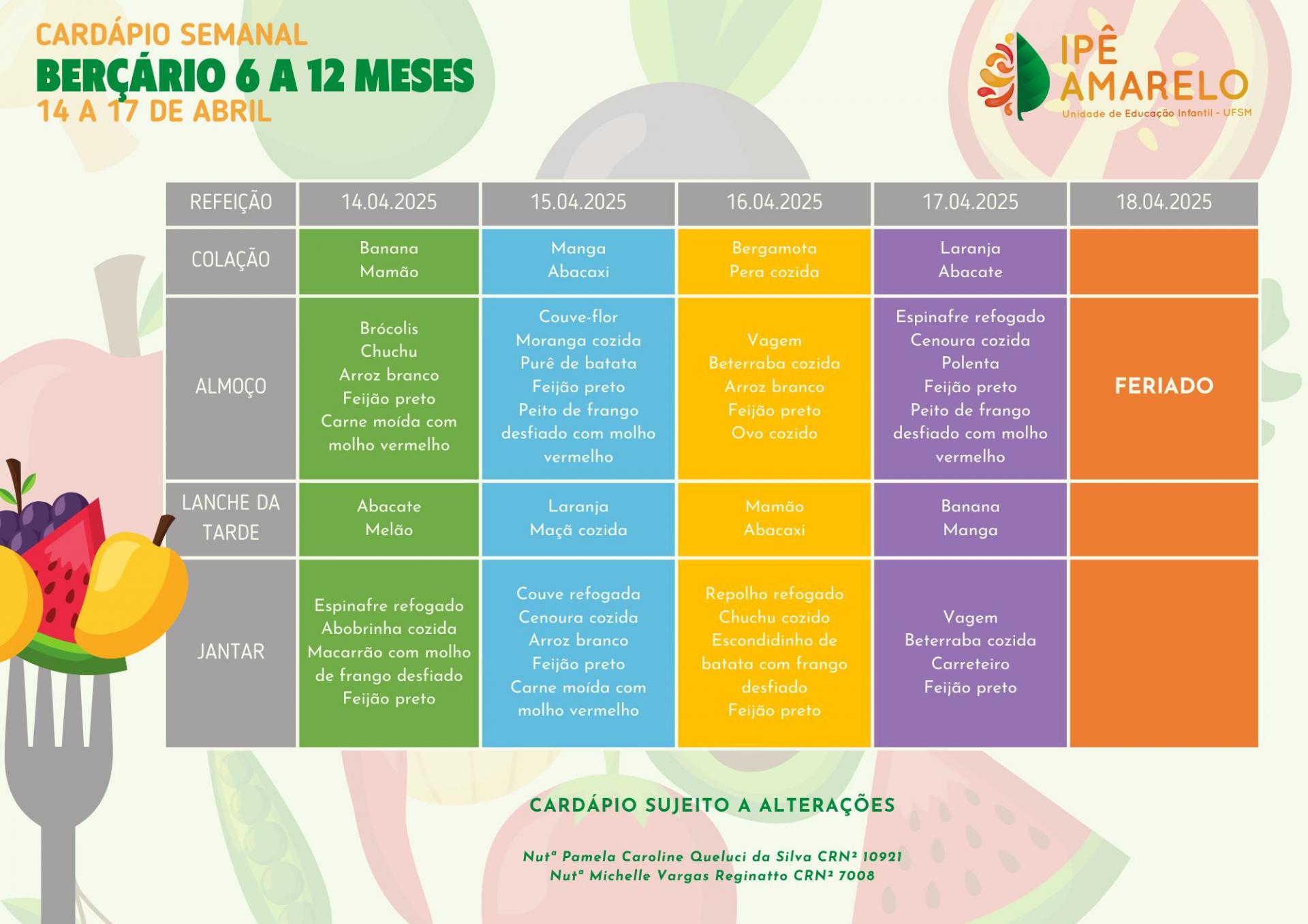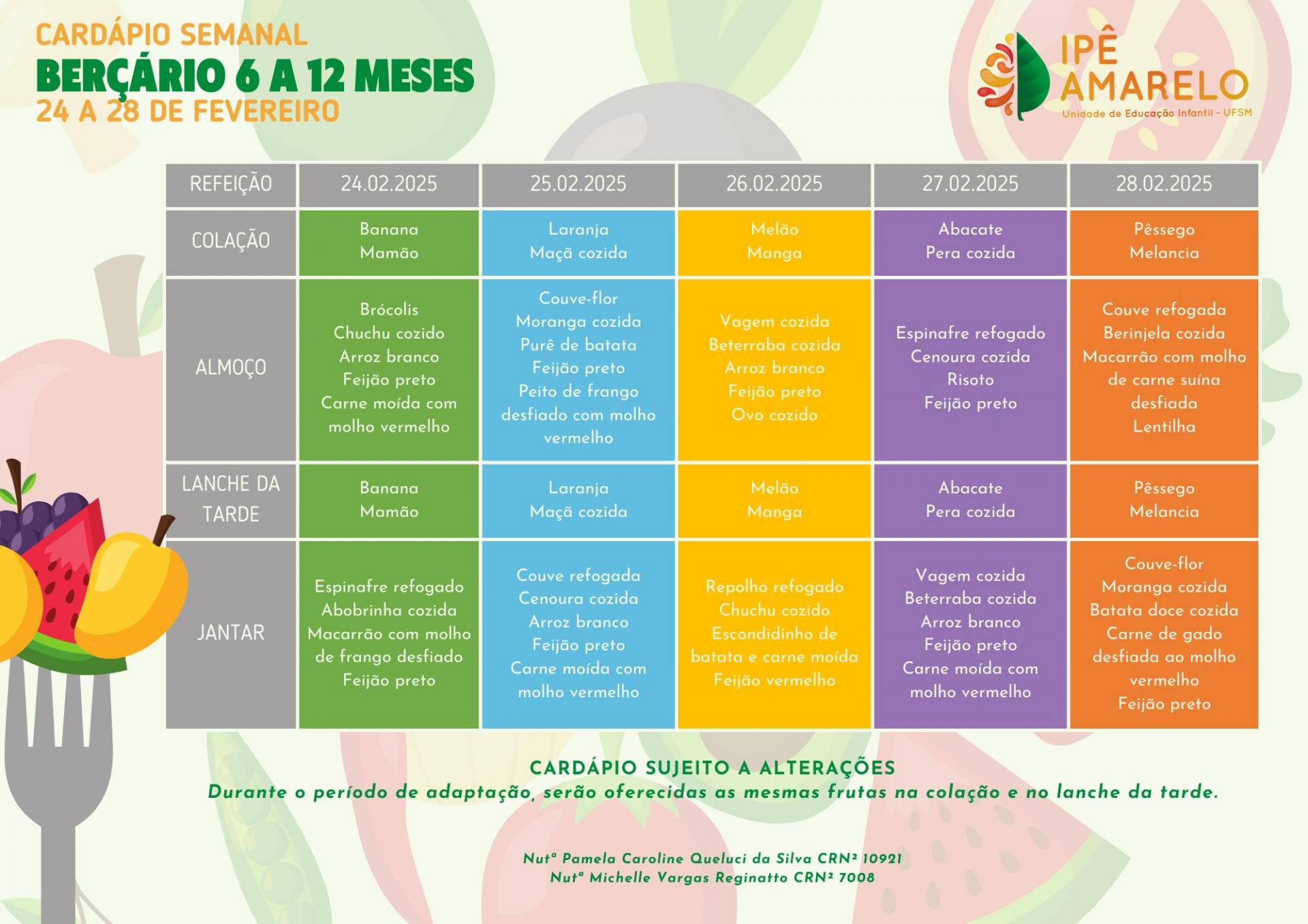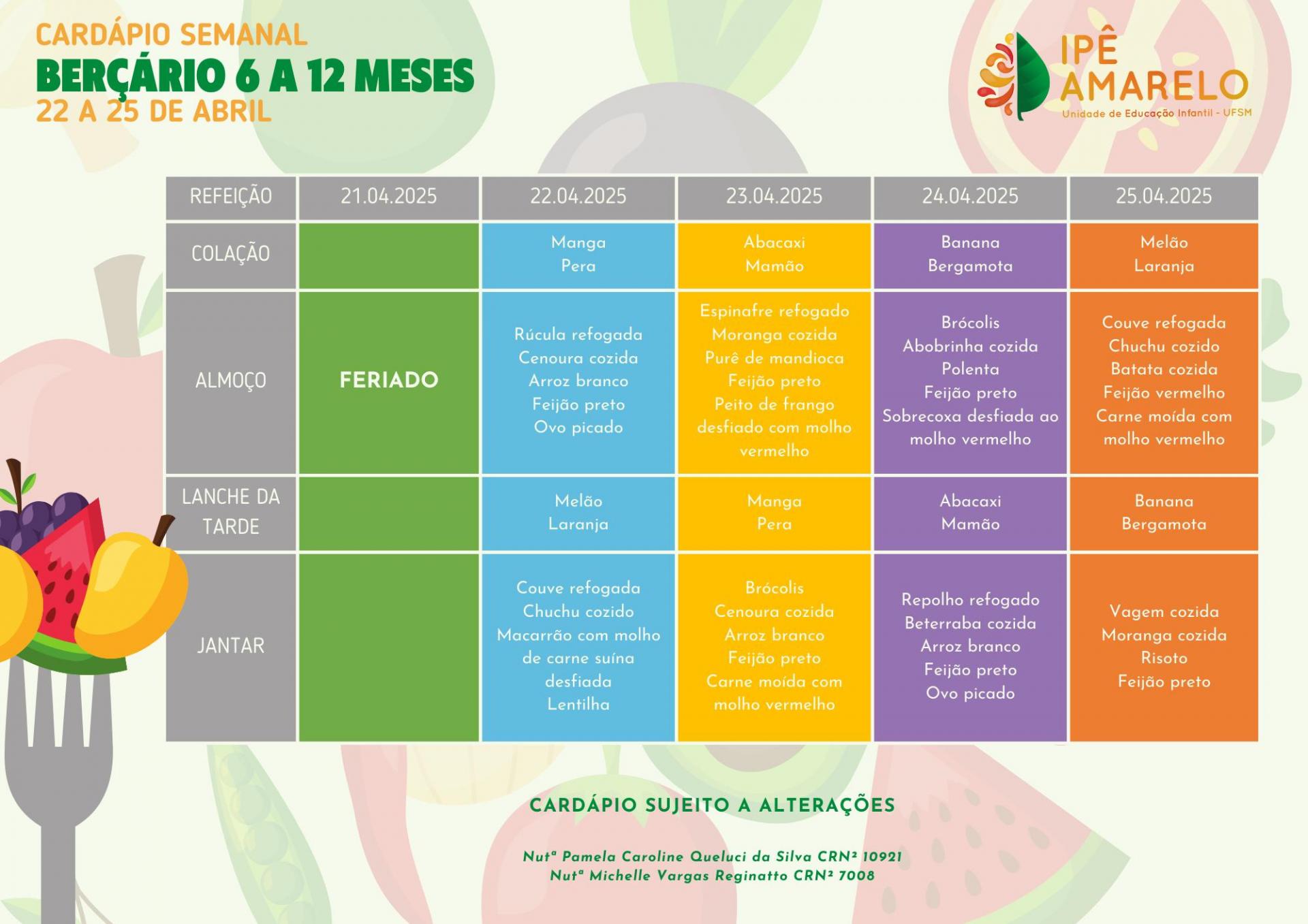 As refeições distribuídas nas turmas de berçário são servidas individualmente pelo cozinheiro e entregues aos professores, que distribuem às crianças. O cardápio destinado às crianças de 6 a 12 meses é composto por 5 refeições: colação, almoço, mamadeira (quando necessário), lanche da tarde e jantar.